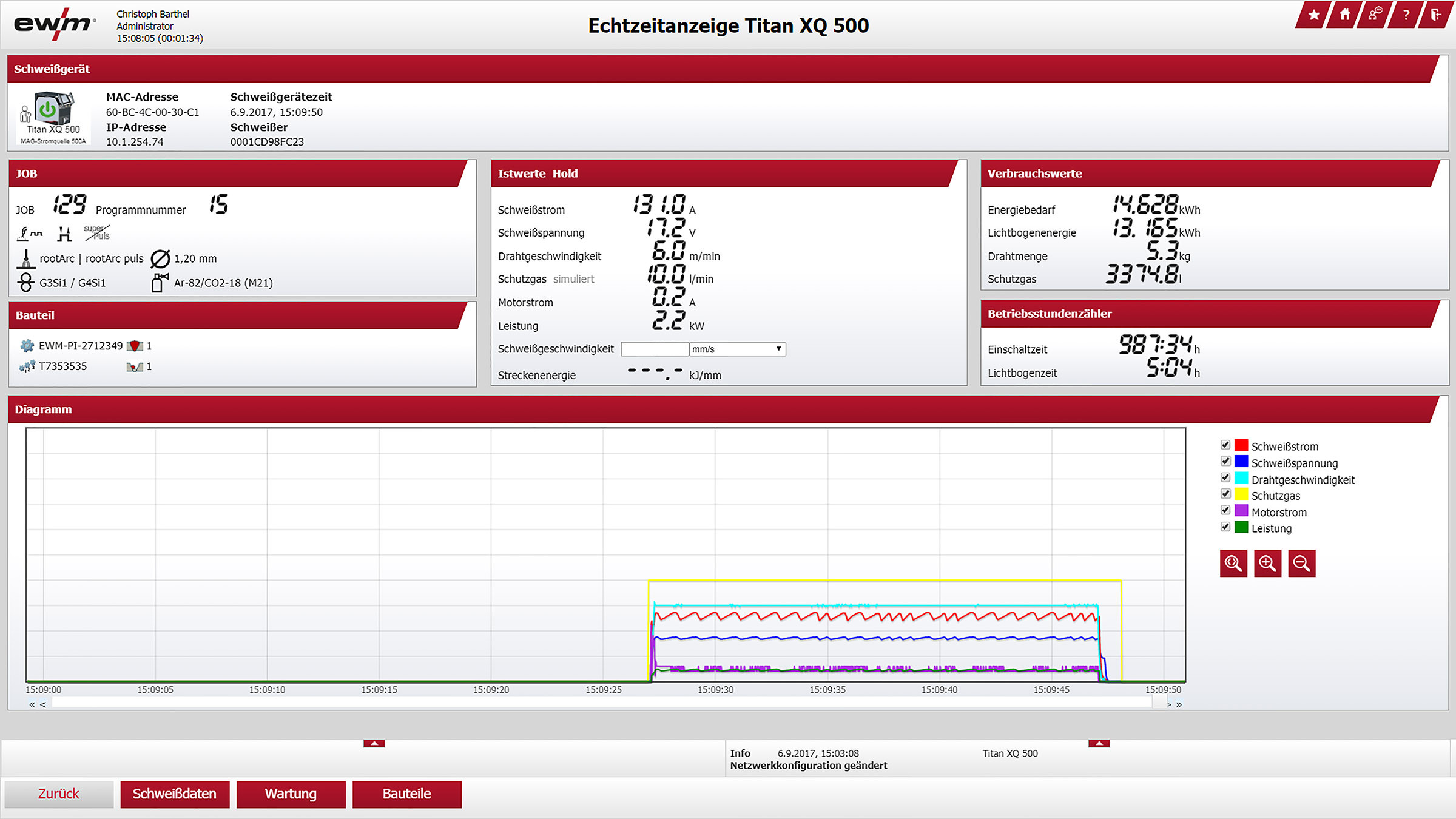 Genau hier macht ewm Xnet Kunden von EWM seit Jahren das Leben leichter. Das Qualitätsmanagement fürs Schweißen unterstützt, dokumentiert und analysiert den gesamten Fertigungsprozess eines Bauteils von der Arbeitsvorbereitung bis zur Nachkalkulation – vollkommen papierlos. Sämtliche Schweißdaten erfasst ewm Xnet in Echtzeit, verwaltet sie und übermittelt die Verbrauchswerte. Dazu unterstützt die innovative Software bei der Bauteilverwaltung, beim Erstellen von Schweißfolgeplänen und beim Zuordnen von Schweißanweisungen. Nicht zuletzt können auch Zugriffsberechtigungen individuell zugewiesen und die Prüfbescheinigungen der einzelnen Schweißer im Auge behalten werden.