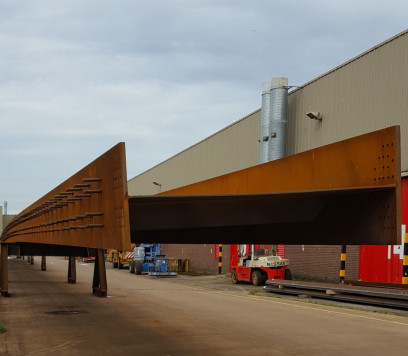 Für die Fertigung der Hauptträger, Membranträger und Versteifungselemente verarbeitete Cleveland Bridge insgesamt 825 Tonnen DIWETEN 460+M. Lediglich für Querträger- und Diagonalverstrebungen sowie für die Verbindungslaschen kam wetterfester S355 zum Einsatz. Dillinger lieferte 60 Bleche DIWETEN 460+M in Dicken von 16 bis 50 Millimeter, bis zu 3,43 Meter breit und 21,31 Meter lang. Cleveland Bridge teilte dann die Gesamtkonstruktion in zwölf transportfähige Fertigungsabschnitte mit sechs unterschiedlichen Längen auf.
