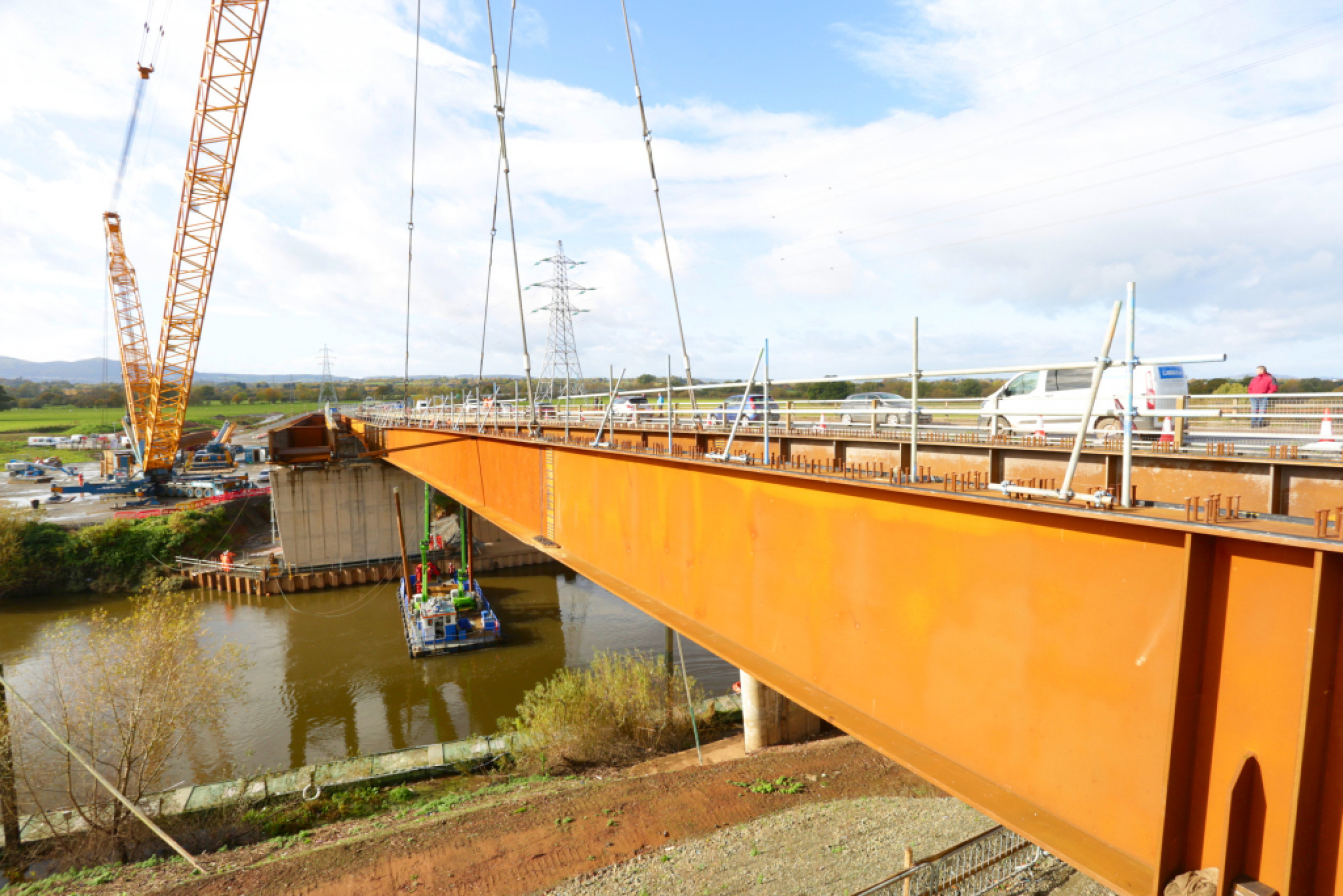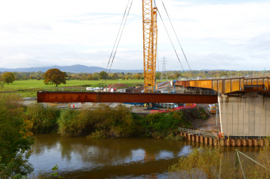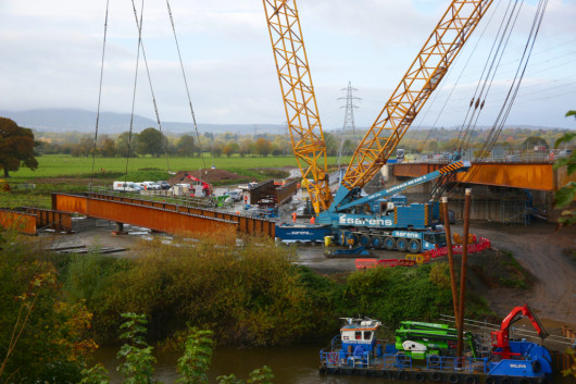 Leider war das ursprünglich geplante Installationsdatum Januar 2020 nicht möglich. Hochwasser vom Fluss Severn sorgte für eine sechsmonatige Verzögerung, durch Covid-19 kamen dann drei weitere Monate hinzu. Die Brücke wurde im November 2020 an ihrem endgültigen Standort installiert. Für ihre Installation hat das Expertenteam empfohlen, zwei 500-Tonnen-Raupenkrane durch einen 1.200-Tonnen-Strebenauslegerkran zu ersetzen, um sicherzustellen, dass die letzten Trägerpaare mit einem Gewicht von 123 Tonnen in einem Radius von 82 Metern über den Fluss gehoben werden können.