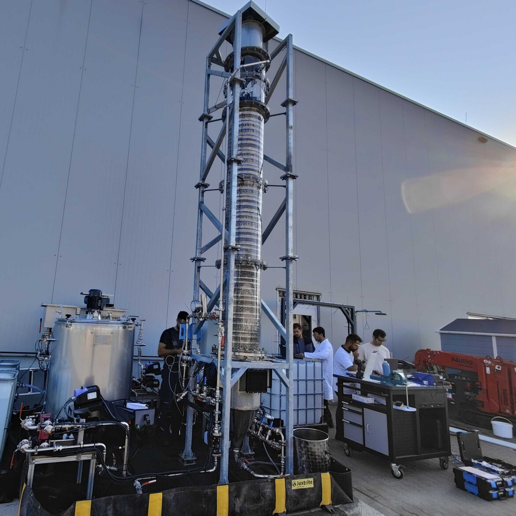 To extract CO2 from the air, it must be brought into contact with the absorbent. Greenlyte accomplishes this at ambient temperature in a so-called gas scrubber – a type of tower in which the liquid absorbent flows downward through a special structure. The design of this structure, called packing in technical terminology, is crucial to achieve maximum distribution and surface area. It is at this surface that the absorbent reacts with CO2 from air, which is continuously blown upward in counterflow through the scrubber. As a result, crystals of potassium bicarbonate form – a salt found in mineral water and used as a leavening agent for gingerbread. This compound contains chemically bound CO2.