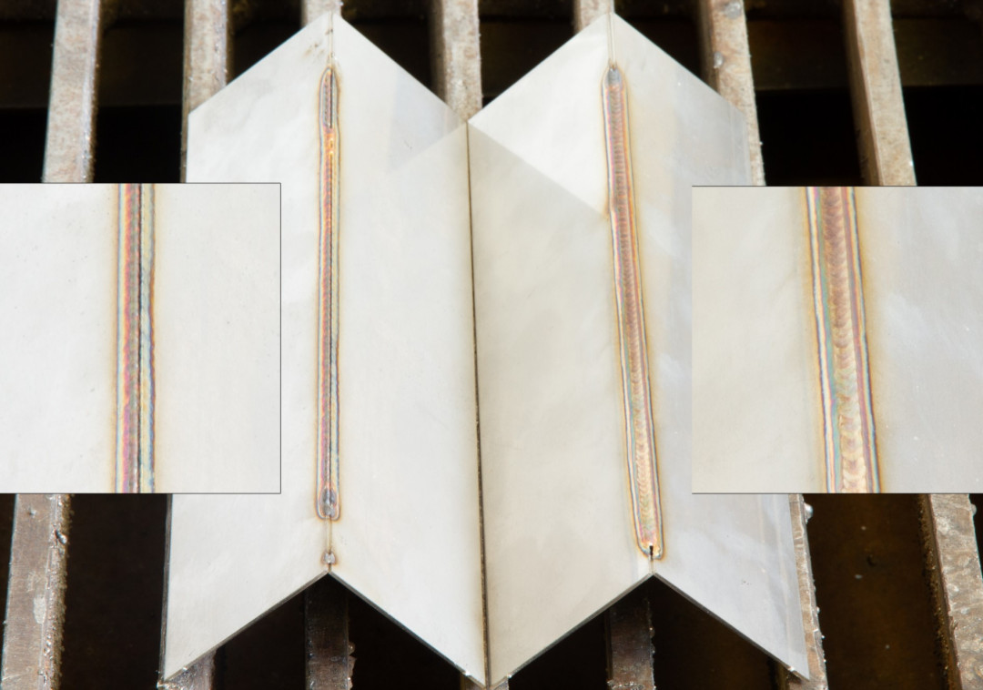 In diesem Test wurden mit einem Hochgeschwindigkeitspuls höhere Schweißgeschwindigkeiten erreicht als mit einem langsamen Puls. Mit dem Doppelpulsverfahren wurden die besten Anlassfarben für Schweißnähte bei säurebeständigem Stahl erreicht. Im Kehlnahttest erreichte das Doppelpulsverfahren Schweißgeschwindigkeiten, die 30 Prozent höher waren als beim Hochgeschwindigkeits-Pulsschweißen. Im Gegensatz zum Eckverbindungstest wurde hier die höchste Schweißgeschwindigkeit mit einem langsamen Puls erreicht, da beim Schweißen einer Kehlnaht vor allem die kurzzeitige hohe Leistung, die das Schmelzbad vorwärts bewegt, zur Verfahrgeschwindigkeit beiträgt. Diese mechanisierten Schweißtests zeigen, dass der Verbindungstyp der Hauptfaktor ist, der bestimmt, ob langsames oder Hochgeschwindigkeitspulsen größere Vorteile bringt.