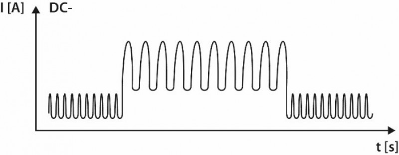 Beim WIG-Doppelpuls-Schweißen werden gleichzeitig langsame (0,2 ... 30 Hz) und schnelle (100 ... 400 Hz) negative Gleichstromimpulse verwendet. Die Prinzipien des Stromverhaltens werden in Abbildung 1 dargestellt. Die Parameter für den Hochgeschwindigkeitspuls werden von einem vorgefertigten Schweißprogramm ermittelt, so dass der Schweißer diese nicht einstellen muss. Die Parameter für den langsamen Impuls sind einstellbar; die Werkseinstellungen sind jedoch für allgemeine Schweißanwendungen gut geeignet.