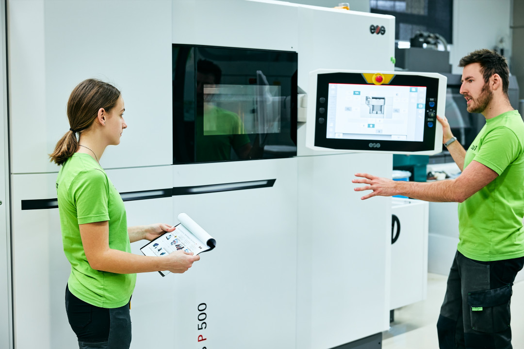 Deutlich erhöhte Geschwindigkeit bei konstanter Qualität: Die neue Kunststoff-Lasersinter-Anlage P500 von EOS macht die industrielle Serienproduktion im 3D-Druck bei Auflagen bis zu 10.000 Stück sinnvoll möglich. Das Dornbirner High-Tech-Unternehmen 1zu1 war seit einem Jahr exklusiver Pilotkunde von EOS. Die Ergebnisse intensiver Tests mit verschiedenen Bauteilen und Werkstoffen flossen direkt in die Weiterentwicklung der Anlage ein.