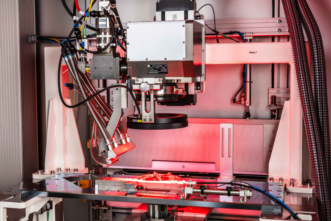 Für das Positionieren des Lasers ist eine Bewegungseinheit mit Scanner-Optik ideal, da diese sehr unterschiedliche Geometrien und Bewegungsprofile ruckelfrei ausführen kann, selbst bei beengten Platzverhältnissen. Dadurch lassen sich auch in einem kleinen Bereich beispielsweise Kreisbahnen oder Achterlinien präzise mit bis zu 10 m/s realisieren. Ein Scanner-System kann den Laserstrahl dabei in der Bearbeitungsposition um eine Zehnerpotenz genauer positionieren als eine herkömmliche Optik. Diese flexible Bewegungseinheit ergänzen die Anlagenbauer von LMB um eine selbstentwickelte Bildverarbeitung, welche die richtige Positionierung der vorgegebenen Schweißstellen sicherstellt.