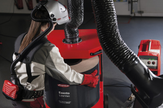 Die leistungsstarke Exento LowVac-Absauganlage mit dem flexiblen Absaugarm zeichnet sich durch ihren großflächigen Erfassungsgrad aus. - © Fronius International GmbH