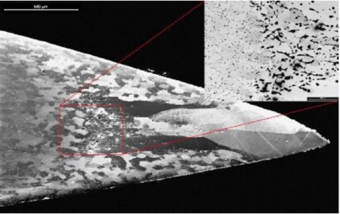 Bei einer starken Vergrößerung sieht man im Material der Wolframelektrode helle und dunkle Bereiche ‒ die sogenannte Körnung. Am Übergang von einem zum anderen Bereich liegen die Korngrenzen. Entlang dieser Korngrenzen sind die Wolframelektroden bei einer mechanischen Beanspruchung besonders empfindlich. Eine Wolframelektrode, die abgekniffen oder abgebrochen ist, ist an den Korngrenzen bereits geschwächt. Wird die WIG-Nadel dann geschliffen, reißt das Material unschön auf.