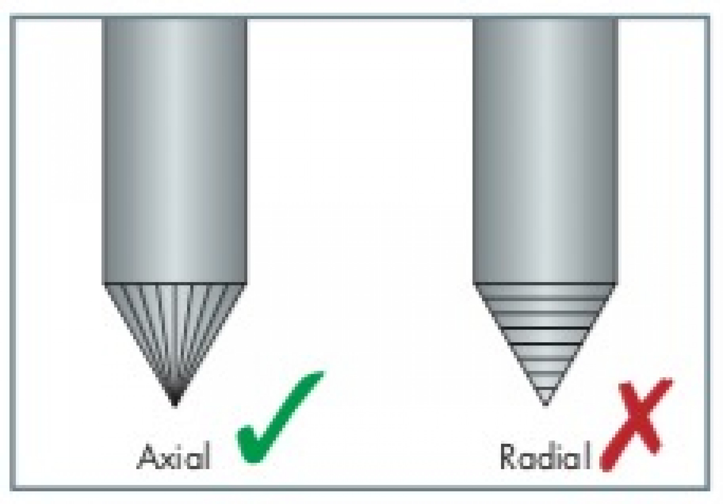 Axial statt radial heißt hier die Devise! Oder anders formuliert: Der Schliff muss längs zur Elektrode erfolgen, dann sind der Lichtbogen fokussierter, der Einbrand tiefer und die Energie lässt sich punktgenau einbringen. Wird quer zur Elektrode geschliffen, also radial, entsteht beim Schweißen ein breiter Lichtbogenkegel. Die Einbrandtiefe wird dadurch geringer und das kann Wurzelbindefehler hervorrufen.