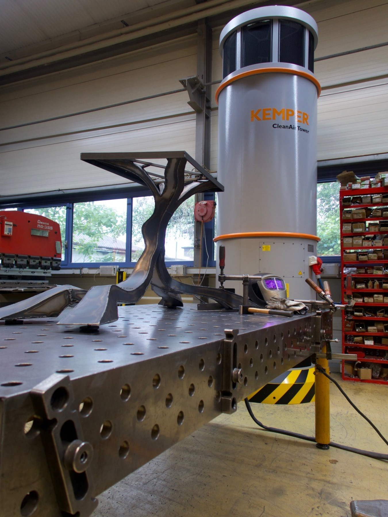 Fronz Metallbau orientierte sich zum Beispiel nicht nur am einzelnen Schweißer, sondern entwarf zusammen mit der KEMPER GmbH, Hersteller von Absauganlagen und Filtersystemen für die metallbearbeitende Industrie, ein Luftreinhaltekonzept für die gesamte Produktion. Während die am jeweiligen Prozess beteiligten Mitarbeiter ohnehin über den nötigen Arbeitsschutz – wie die Punktabsaugungen für die Schweißer – verfügten, sollten auch Mitarbeiter an umliegenden Arbeitsplätzen den nötigen Arbeitsschutz erfahren.