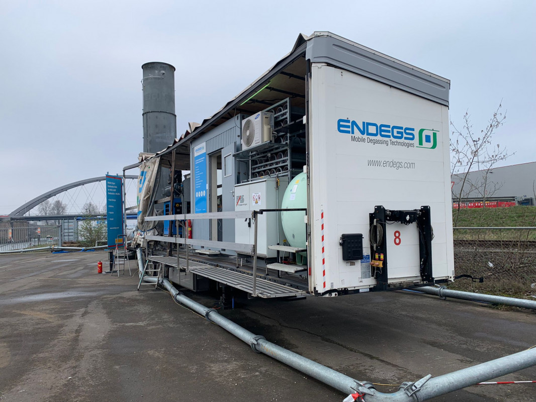Die Schiffsentgasungsstelle der ENDEGS GmbH umfasst eine Fläche von knapp 4.000 Quadratmetern und ist ein wichtiger Bestandteil für einen umweltfreundlichen Betrieb im Duisburger Binnenhafen. Noch immer ist es vielerorts üblich, Schiffe ins Freie zu ventilieren oder Dämpfe von Schiffsladungen abzulassen, was eine erhebliche Belastung für die Umwelt sowie Anwohner darstellt. Bis zur Eröffnung der Schiffsentgasungsstelle von ENDEGS gab es auch im Duisburger Hafen keine Möglichkeit, die Restgase von Tankschiffen ordnungsgemäß zu entsorgen. Seit März 2020 ist im Duisburger Hafen dauerhaft eine mobile Brennkammer der ENDEGS GmbH für die Entgasung von Binnenschiffen stationiert. Die Anlage verbrennt Gase, Gasgemische und Dämpfe der Explosionsgruppen IIA, IIB und IIC umweltfreundlich ohne offene Flamme sowie geruchslos und mit einer Effizienz von mehr als 99,99 %.