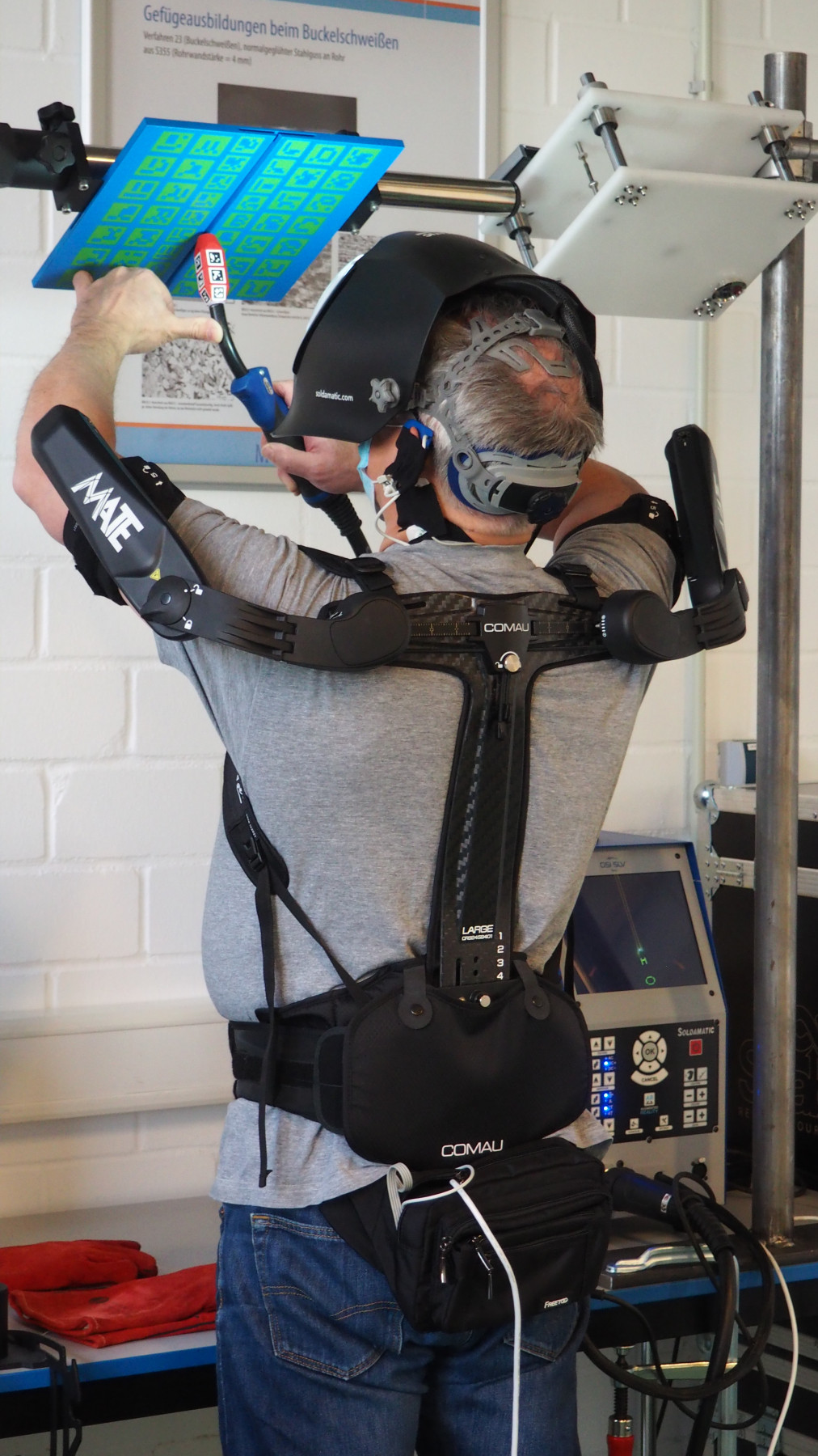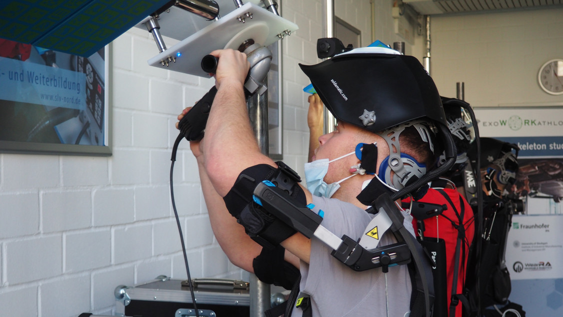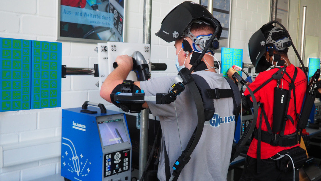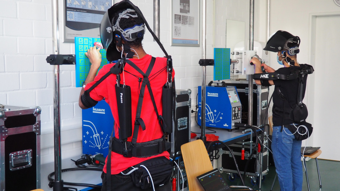 In Hamburg-Harburg hatten sich 28 Auszubildende aus großen metallverarbeitenden Unternehmen für die Forschung zur Verfügung gestellt. An drei Schweißsimulatoren, virtuellen Schweißtrainern, konnten sie verschiedene Exoskelette während schwieriger Schweißarbeiten anwenden. Statt durch eine Sichtscheibe in ihrem Schutzschild, schauten die jungen Schweißer jedoch auf einen integrierten Bildschirm, der ihnen sehr genau das Schweißgerät und die Naht zeigte, an der sie arbeiteten. Wie beim echten Schweißen sahen sie, wie die Schweißnaht wuchs, aber auch jeden Fehler und jede Abweichung von der Idealnaht. Anschließend glätteten sie ihre Schweißnaht ebenfalls an einem vom Fraunhofer IPA entwickelten Prüfstand, der die beim Schleifen auftretenden Belastungen mit einem präparierten Winkelschleifer simuliert.