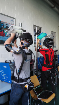 In Wirklichkeit hielten die Auszubildenden aber eine nachempfundene MAG-Schweißpistole in der Hand, mit der sie sich langsam entlang einer senkrechten Rille in einem einfachen, blauen Kunststoffbrett bewegten. Auf die Platte und den Handgriff des Schweißgeräts waren QR-Codes aufgedruckt, die dem Rechner für die virtuelle Realität als Navigation diente. Den nur mit einer Kunststoffscheibe ausgestatteten, präparierten Winkelschleifer bewegten sie auf dem genannten Prüfstand daneben.