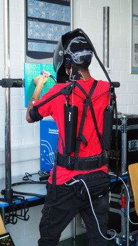 Tom, Jan Niklas und Lukas waren drei von ihnen. Tom war regelrecht begeistert: „Mit so einem Exoskelett könnte ich einfach noch drei Stunden weiter schweißen.“ „Ich finde, das Exoskelett ist eine gute Sache“, fand auch Jan Niklas. „Wenn man kopfüber schweißt, entlastet das die Arme schon sehr.“ Nicht ganz so zufrieden war er jedoch mit der virtuellen Umgebung. „Wenn man durch eine normale Schutzscheibe guckt, kann man den Abstand der Elektrode von der Schweißnaht besser einschätzen.“ Das fand auch Lukas: „Der Abstand ist nicht klar.“ Aber er war auch nicht besonders glücklich mit seinem Exoskelett: „Es war zwar ein bisschen leichter, die Arme hoch zu halten, aber über dem Kopf zu arbeiten war nicht unbedingt einfacher.“