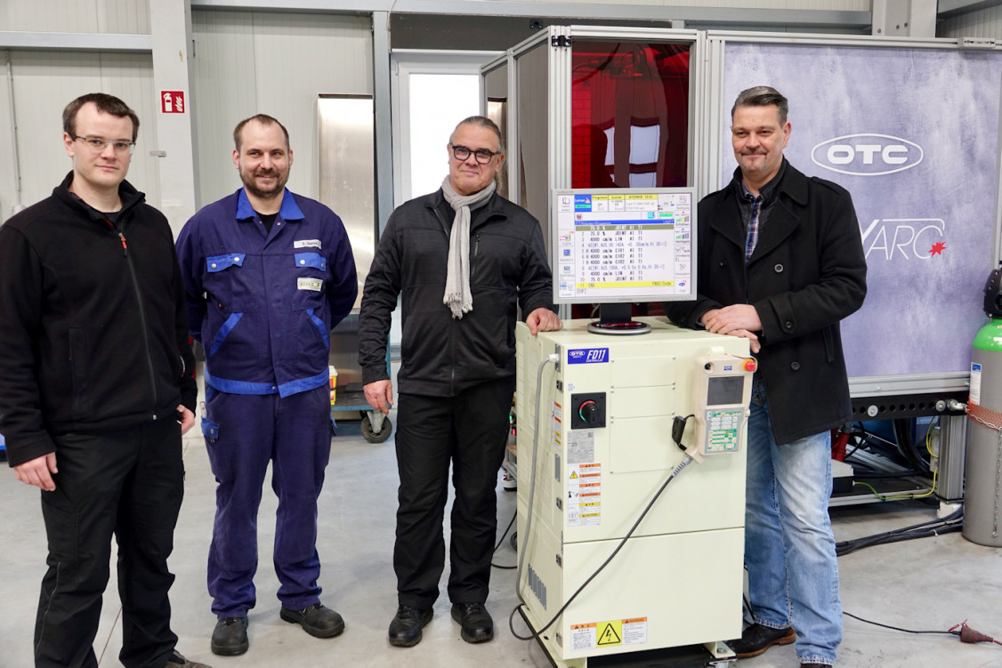 Die neue Schweißroboterstation EASY ARC von OTC bei der Rodeike Feinblechverarbeitung GmbH & Co. KG in Voerde. (Von links: Jens Radomski, Sebastian Siems, Hans Gerd Radomski und Michael Krone von Krone Schweißtechnik und Industriebedarf). - © OTC