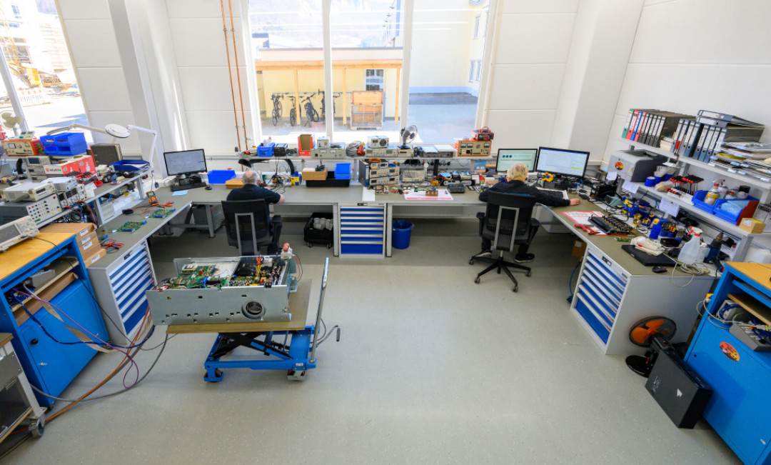 „Die Aufgaben in unserer Abteilung sind vielfältig. Wir kümmern uns um Leistungselektronik in der Größe eines Kleiderschrankes bis hin zu filigraneren Arbeiten an Platinen auf Bauteilebene“, erläutert Schunn. Für die tägliche Arbeit sind Löttechnik, Lupen und Mikroskope genauso erforderlich wie ein Röntgengerät und eine Rework-Station für elektronische Bauteile. „Wir haben von Beginn an die Ausstattung von KRIEG benutzt. Das war schon so, als es anfangs gerade einmal fünf Arbeitsplätze gab. Mittlerweile haben wir mehr als 100 Plätze mit dem System von KRIEG ausgestattet und werden auch in Zukunft auf die Kompetenz und Qualität der Firma vertrauen.“