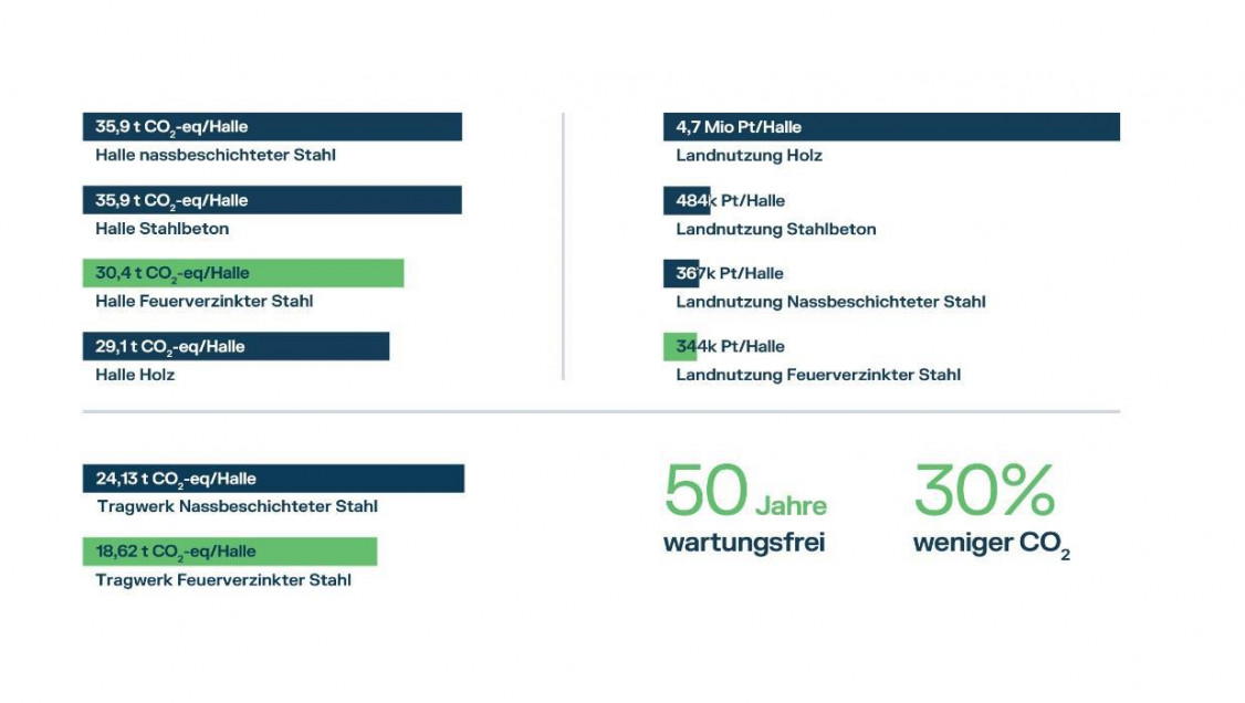 Auf dem Zukunftsforum des Industrieverbandes Feuerverzinken wurde die Zusammenfassung der Ergebnisse einer umfassenden Studie zur vergleichenden Ökobilanz von Varianten einer Hallenkonstruktion präsentiert. Die Studie vergleicht vier Bauweisen – feuerverzinkten Stahl, nassbeschichteten Stahl, Stahlbeton und Holz – hinsichtlich ihrer Umweltwirkung über den gesamten Lebenszyklus. Dabei zeigt sich, dass feuerverzinkte Stahlkonstruktionen 30 Prozent weniger CO2 emittieren als vergleichbare, nassbeschichtete Tragwerkskonstruktionen.