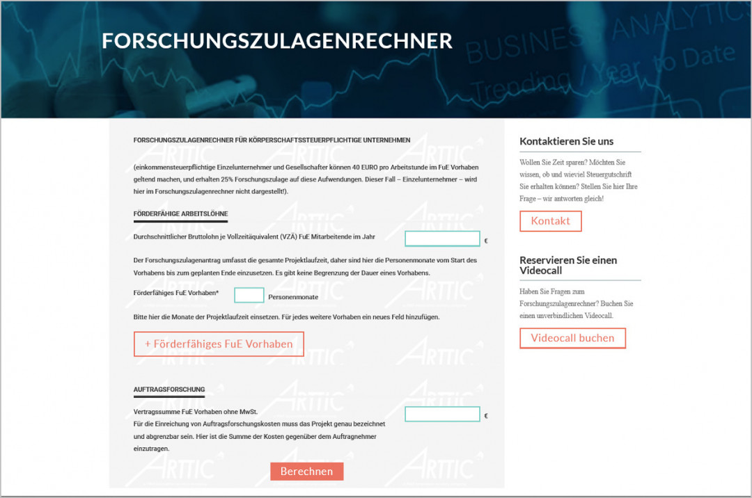 Die ARTTIC Innovation GmbH aus München präsentiert auf der Webseite zum neuen Forschungszulagengesetz einen Online-Rechner für die erste Abschätzung der erstattbaren Aufwendungen für die industrielle Forschung.