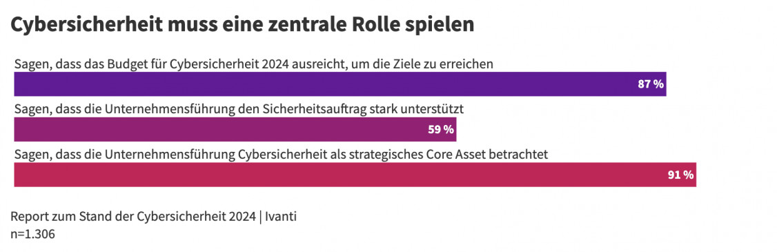 Im weltweiten Vergleich belegt das deutsche Management Spitzenplätze. Denn hierzulande stufen neun von zehn Unternehmensleitern Cybersicherheit als Kernthema ein (94 Prozent), diskutieren es auf Leitungsebene und verfügen über ausreichend Budget, um die Sicherheitsziele zu erreichen. Diese Aussagen unterstreichen, dass Cybersicherheit als geschäftskritischer Erfolgsfaktor eingestuft wird.
