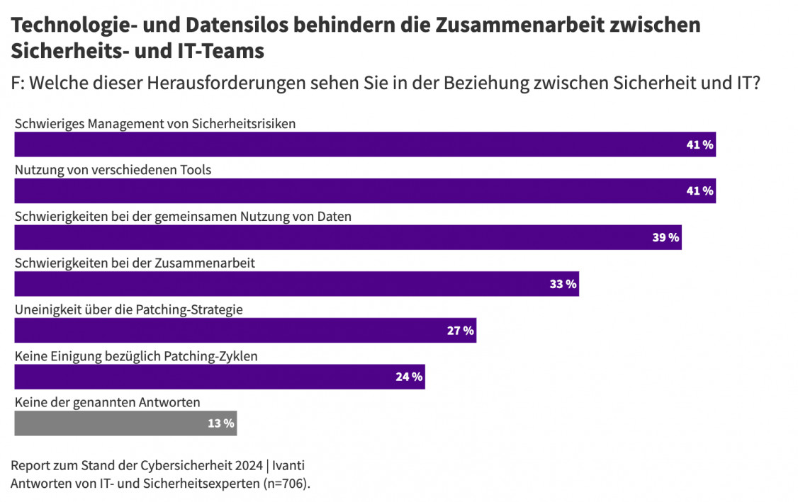 Bei 72 Prozent der deutschen Unternehmen befinden sich IT- und Sicherheitsdaten in isolierten Silos. Im Gegensatz zu ihren internationalen Kollegen geben 45 Prozent der deutschen Sicherheitsexperten zwar an, dass sich ihre Reaktionszeiten dadurch nicht verlangsamen. Dennoch beklagen sie die zahlreichen, unterschiedlichen Tools und den mühsamen Datenaustausch zwischen IT- und Security-Teams. Durch diese Trennung entstehen ständige Reibungspunkte, beispielsweise im Bereich der Patching-Strategie im Unternehmen.