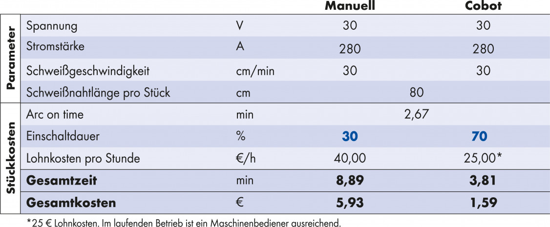 Ein großer Unterschied zwischen der Leistung des Handschweißers und der Leistung des Cobots besteht im Hinblick auf die Stückkosten und resultiert aus der jeweiligen „Einschaltdauer“, wobei im Hinblick auf den Handschweißer eher von „Einsatzdauer“ die Rede ist. Doch ungeachtet dessen: Die aktive Arbeitszeit des Cobots ist im Vergleich zum Handschweißer mehr als doppelt so hoch. Damit reduziert sich zum einen die erforderliche Gesamtzeit für die Produktion, die Lohnkosten für die Produktion eines Teils mit einem Cobot sind ebenfalls niedriger und letztlich sinken dadurch auch die Gesamtkosten.