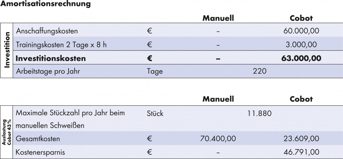 Im Einschichtbetrieb haben sich die Kosten für die Anschaffung eines Schweiß-Cobots bereits nach einem Zeitraum zwischen 0,6 und 1,3 Jahren amortisiert