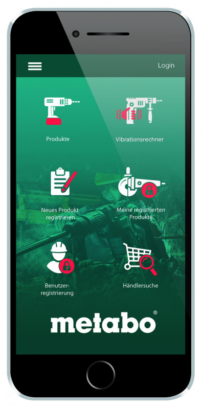 Mit der neuen Metabo-App können Handwerker und Händler ihre Maschinen schnell registrieren, erhalten so die erweiterte Garantie von drei Jahren und haben alle Informationen jederzeit im Blick. Ein integrierter Vibrationsrechner zeigt zudem an, wie lange Anwender mit einer Maschine arbeiten können, ohne dabei gesundheitliche Risiken einzugehen.