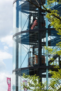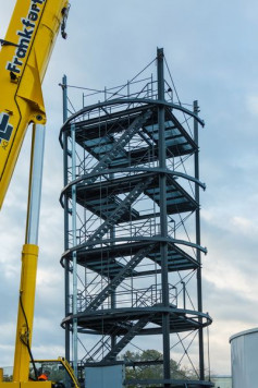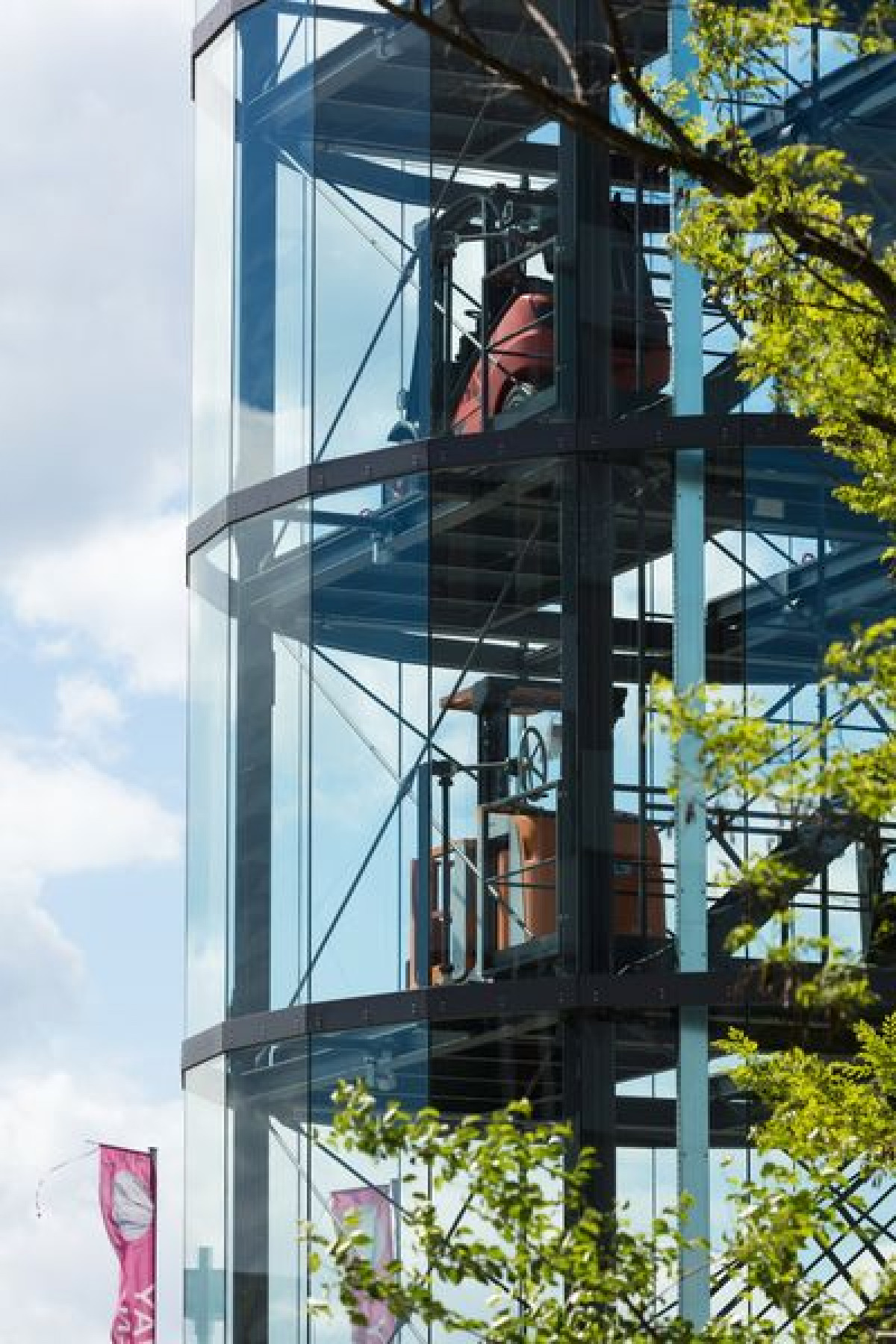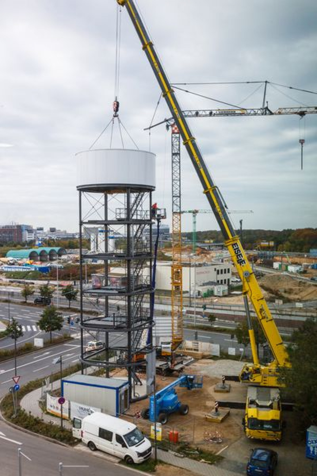 Mit der Montage des Towerkopfes Ende Oktober 2017 erreichte der Turm seine geplante Höhe von 25 Metern. Ca. 60.000 kg Stahl wurden dafür verschweißt und verschraubt. Mit der später folgenden Montage von 144 segmentierten Glasscheiben à 200 kg entstand schließlich eine gelungene Symbiose aus Metall-, Glas- und Maschinenbau.