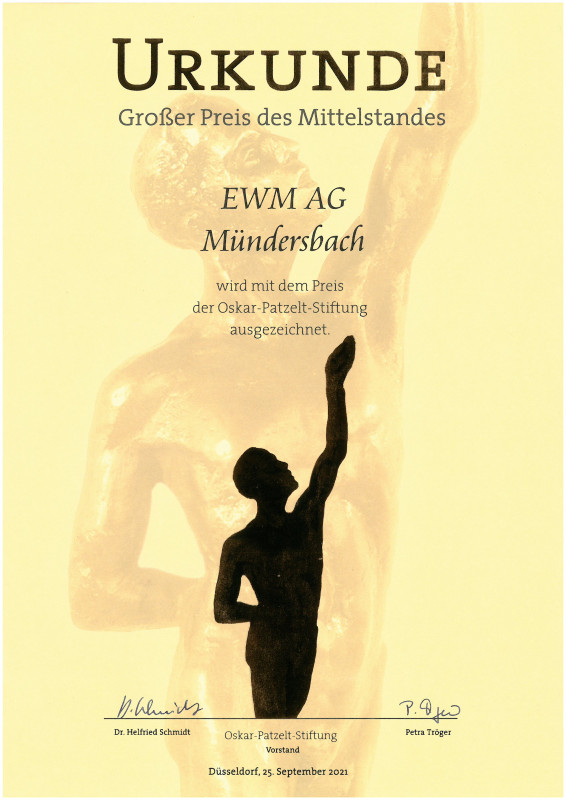 Der Große Preis des Mittelstandes wird seit 1995 von der Oskar-Patzelt-Stiftung vergeben. Entscheidend für die Auszeichnung sind fünf Kategorien: Gesamtentwicklung, Beschäftigung, Innovation, Engagement und Marketing. Somit werden die Unternehmen nicht nur nach einzelnen betriebswirtschaftlichen Kriterien bewertet, sondern auch ihr Mehrwert für die Gesellschaft wird gewürdigt. Hauptziel ist es, wirtschaftliche und soziale Leistungen des Mittelstands anzuerkennen und durch den Preis öffentlich zu machen. Am 25. September 2021 wurde der Große Preis des Mittelstandes in Düsseldorf vergeben. Aus 4.674 nominierten Unternehmen wurde EWM als einer von drei Siegern aus der Region Rheinland-Pfalz/Saarland ausgezeichnet.
