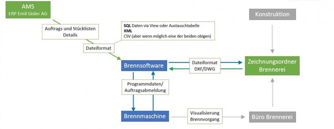 Neben den Vorgaben für die neuen Brennschneidmaschinen – Steigerung der Qualität und Durchsatzleistung, Erhöhung der Prozesssicherheit, Minimierung von Verschleißteilkosten und Kompatibilität der Maschinen – standen vor allem hohe Anforderungen an die Software auf dem Plan. Dem Abteilungsleiter Brennschneid- und Abkantcenter Raffael Imgrüt und seinem Team ging es hier vor allem um die Bedienerfreundlichkeit der Software sowie intelligentes Schachteln und die Digitalisierung der Auftragsbearbeitung. Letztere sollte über die Anbindung des bestehenden ERP-Systems umgesetzt werden. Dazu wurden die Prozesse und Schnittstellen im Pflichtenheft definiert.