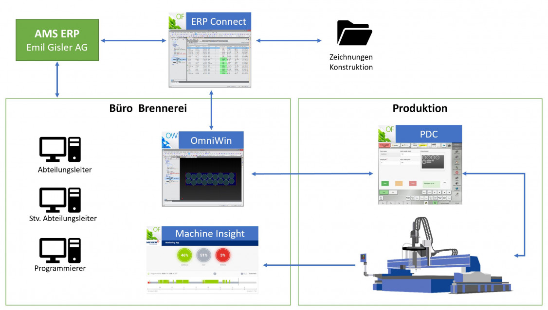 OmniFab ist das Werkzeug, mit dem Unternehmen aus der Brenn- und Schneidtechnik die digitale Transformation vorantreiben. Die OmniFab Suite dient der Produktionsplanung, -steuerung und -überwachung, indem sie die Daten "veredelt". Diese Daten bringen Mehrwert, weil sie kontextbezogene Informationen liefern. Dabei stellt das Modul OmniFab ERP Connect die Verbindung zum ERP-System AMS her. So erfolgt der automatische Austausch von Auftragsdaten aus AMS an OmniWin und ein automatischer Zeichnungsimport der Zeichnungen aus der Konstruktion. Auch die Rückmeldung von Produktionsdaten zurück an das ERP-System erfolgt automatisiert.