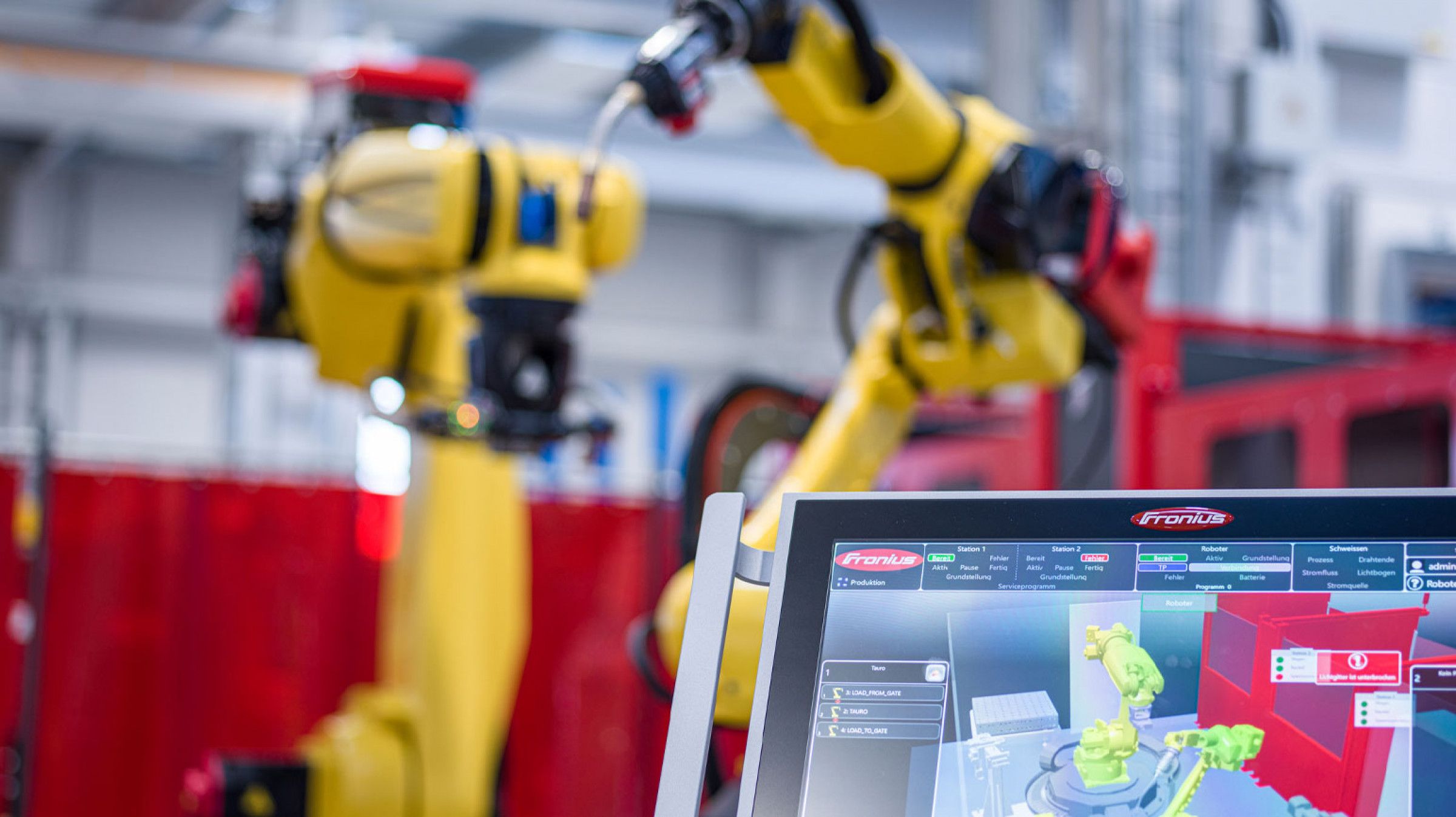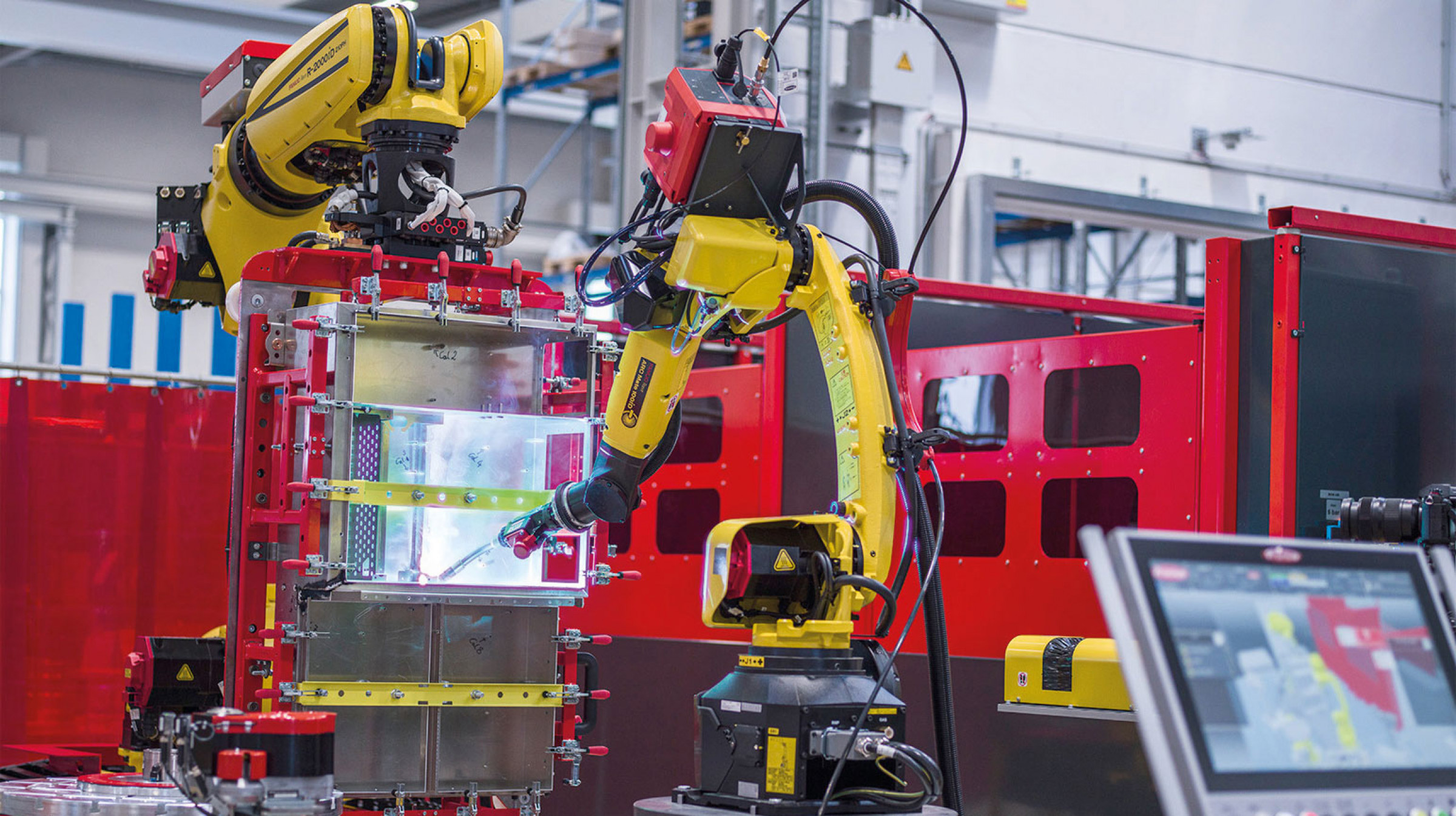 Fronius setzt bei seiner Lösung auf die Zusammenarbeit von zwei Robotern: Der Handling-Roboter greift die Werkstücke und hält sie in Position, der zweite Roboter schweißt. Diese Kombination erlaubt höchste Flexibilität im Hinblick auf Bauteil- und Los-Größen sowie Nahtgeometrien – selbst bei winkligen Bauteilen.