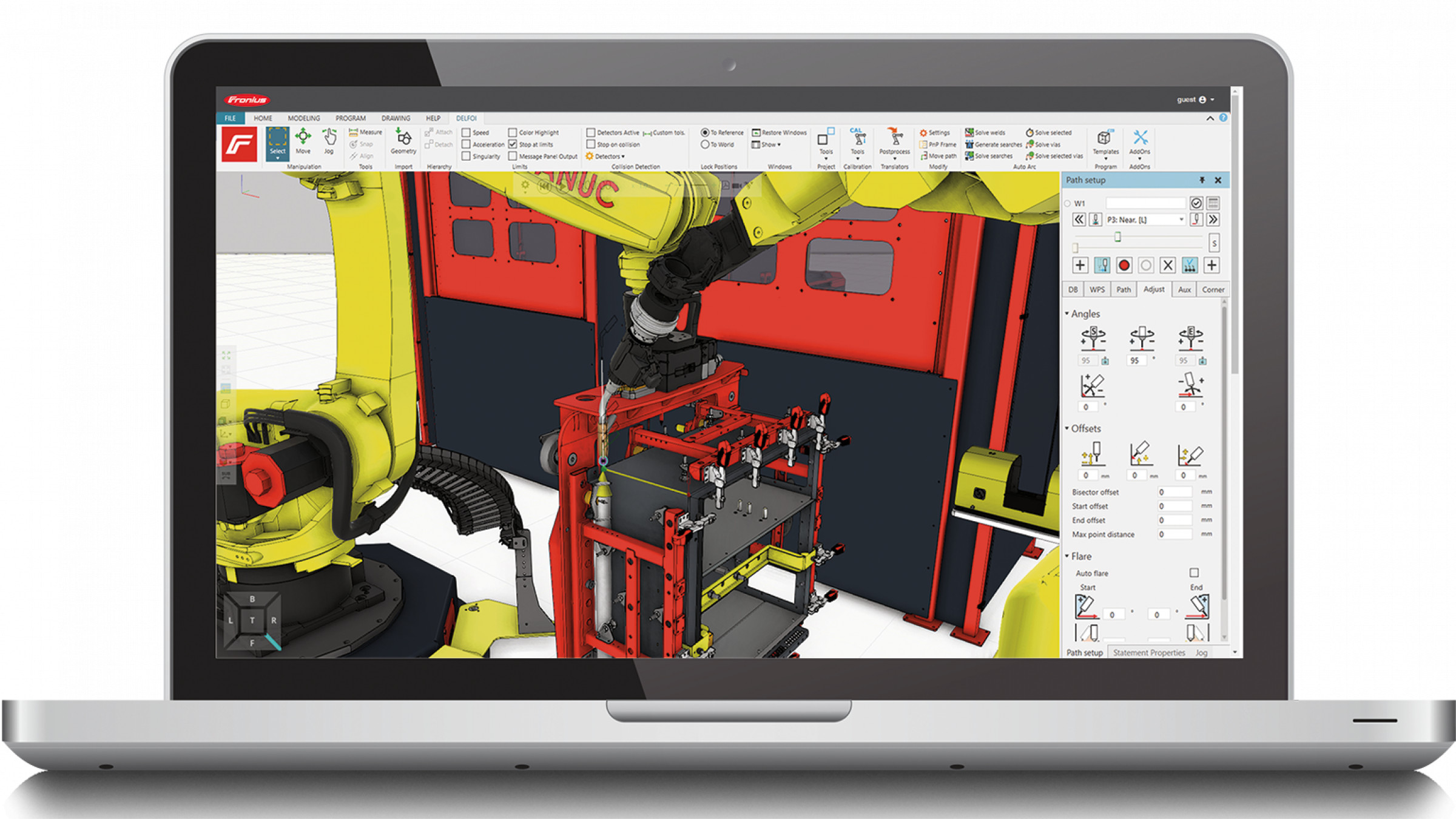 Noch effizienter wird die modulare HTW- Schweißzelle durch die Fronius Pathfinder Software. Bisher mussten laufenden Schweißarbeiten erst beendet werden, um den nächsten Prozess programmieren zu können. Pathfinder ermöglicht es nun, den neuen Schweißprozess während des laufenden Betriebs zu programmieren – und zwar offline, also getrennt von der Roboterschweißzelle. Dabei erkennt die Software Achslimits, berechnet Startpunkte, Endpunkte sowie Anfahrtswege und setzt selbstständig Teach-Punkte. Störkonturen können visualisiert und Brenneranstellungen entsprechend und rechtzeitig korrigiert werden. Zudem geschieht das Ganze im Vorfeld und nicht während der ersten Schweißversuche – was zusätzlich Zeit und Kosten spart.