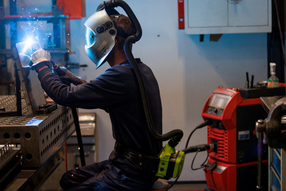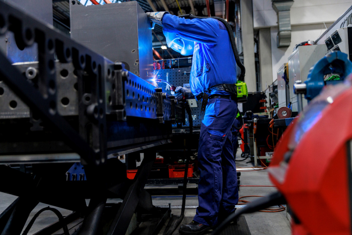 Gesunde Beschäftigte sind keine Selbstverständlichkeit – engagierte sowieso nicht. Da das eine vom anderen abhängt, setzt man bei Knoll auf ergonomische Arbeitsplätze und bestmögliche persönliche Schutzausrüstung. Sämtliche Schweißtische sind höhenverstellbar, automatisch abdunkelnde Schweißhelme plus Frischluftzufuhr längst Standard. Außerdem wird die Raumluft viermal in der Stunde erneuert. „Ergonomie am Arbeitsplatz ist ein wichtiges Thema“, erörtert Riebsamen. „Nicht nur gesundheitlich, sondern auch wirtschaftlich. Unkomplizierte, individualisierte Bedienung, kurze Wege zwischen Bauteil und Schweißgerät – all das wirkt motivierend, spart wertvolle Zeit und steigert die Produktivität von Schweißerinnen und Schweißern.“