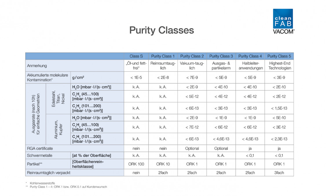 Die bei der Reinigung zu erfüllenden Vorgaben zur partikulären Sauberkeit erfolgt durch Angabe der entsprechenden Oberflächenreinheitsklasse (ORK). Die filmisch-chemische, organische und anorganische Oberflächenreinheit wird meist durch individuelle Spezifikationen beziehungsweise Werksnormen definiert. Hinzu kommen gegebenenfalls Ausgasungsraten, die über Massenspektrometer ausgewertet werden. Diese Vorgaben sind üblicherweise nicht allgemein zugänglich.