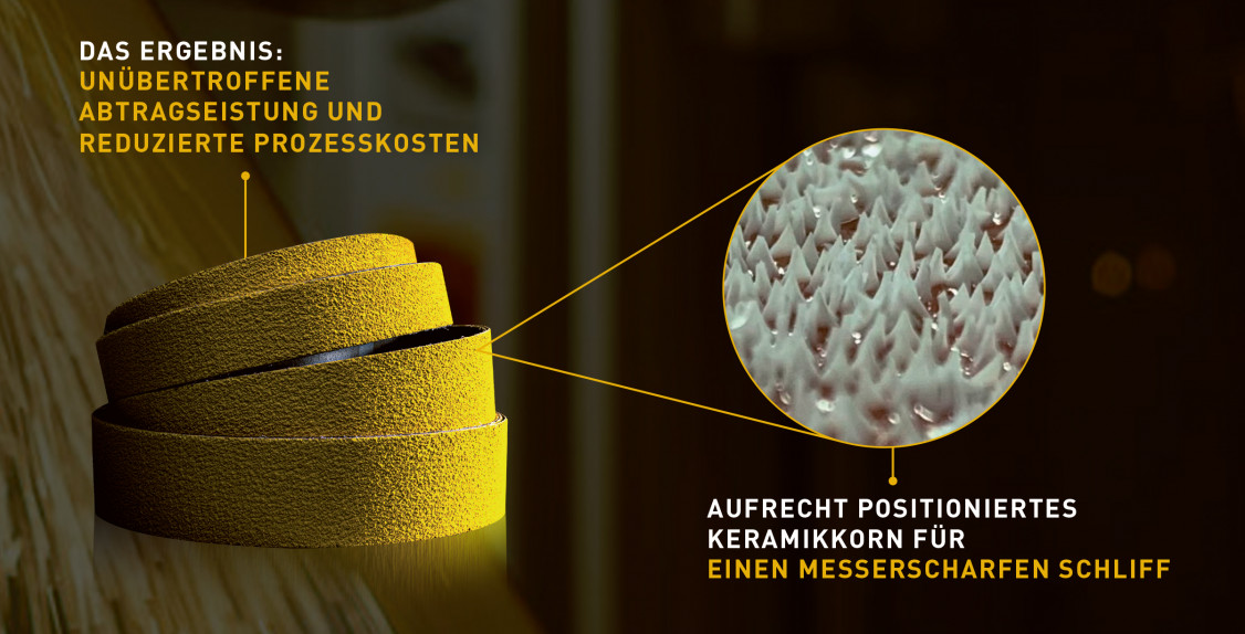 Darüber hinaus bietet die neue Technologie einen bisher unvergleichbar hohen Anteil an aufrecht auf der Unterlage angeordneten Keramikkörnern. Dadurch wird nicht nur ein besonders effizienter und hoher Materialabtrag erreicht, sondern auch für ein besonders homogenes Schliffbild auf der Oberfläche gesorgt. Dies reduziert weitere zeitaufwändige Nachbearbeitungen erheblich. Kombiniert mit der hohen Korndichte, dem angepassten Bindungssystem und der robusten Polyester-Unterlage werden die Haltefähigkeit der Körner und die Fähigkeit zur Bildung neuer scharfer Schleifkanten bei mittlerem bis hohem Druck gefördert.