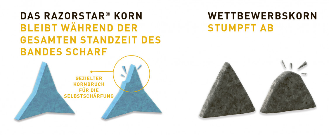Mit dem von Saint-Gobain entwickelten, innovativen Hochleistungs-Keramikkorn setzen Norton RazorStar®-Schleifbänder neue Maßstäbe in puncto Produktivität, Geschwindigkeit und Standzeit während des Schleifprozesses. Verbesserte Schleifleistung, längere Standzeit und ein kühlerer Schliff sorgen für unübertroffene Abtragsleistung, höhere Werkstückqualität, reduzierten Energiebedarf, weniger Abfall und damit geringere Prozesskosten.