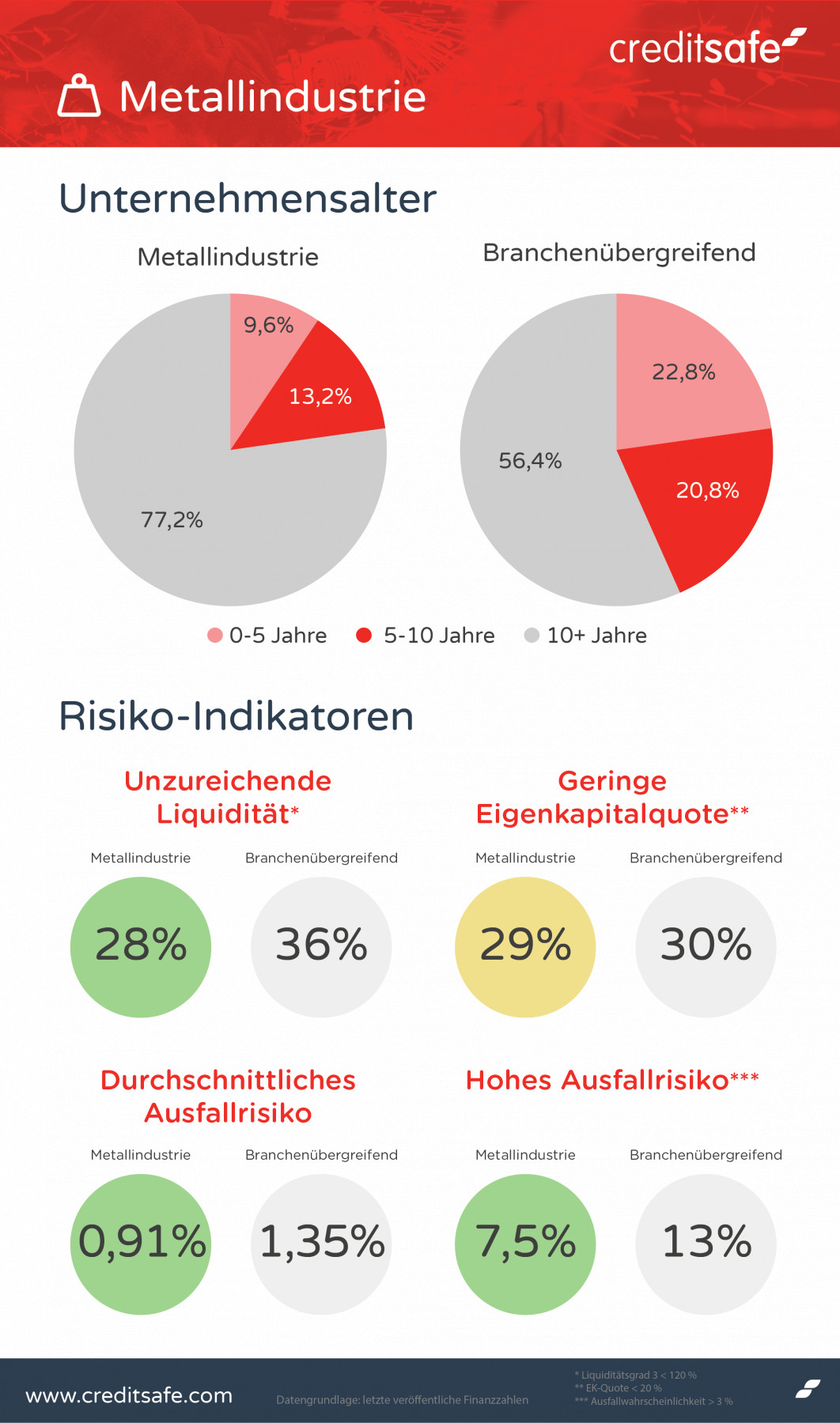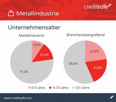 Die Auswertung von Creditsafe zeigt, dass die Metallindustrie in Deutschland auf vergleichsweise sicheren Beinen steht. Grund dafür kann der vergleichsweise hohe Anteil älterer Unternehmen sein: Mehr als 70 Prozent aller Unternehmen sind in dieser Branche älter als zehn Jahre, der Anteil an Firmen, die jünger als fünf Jahre sind, ist mit zehn Prozent dementsprechend gering. Zum Vergleich: In Deutschland sind im Durchschnitt 56 Prozent der Firmen älter als zehn Jahre und mehr als 20 Prozent jünger als fünf Jahre.
