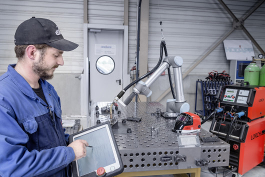 „Der Cobot passt perfekt in unseren Werkzeugkasten“, konstatiert Ralph Schröppel, Leiter des Bereichs Feinblech bei H.P. Kaysser. Denn der Schweiß-Cobot lässt sich mit seinen 30 Kilogramm extrem leicht versetzen, braucht wenig Platz und ist ohne aufwendige Schutzeinrichtung in jede Produktionsumgebung sofort integrierbar.