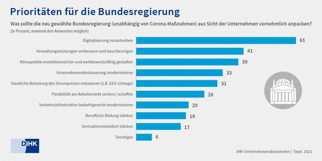 Die deutschen Unternehmen erwarten von der künftigen Bundesregierung deutlich mehr Tempo und ein besseres Umfeld für ihre erforderlichen Investitionen. Das geht aus dem vom Deutschen Industrie- und Handelskammertag (DIHK) veröffentlichten IHK-Unternehmensbarometer zur Bundestagswahl 2021 hervor. Die Ergebnisse basieren auf Antworten von rund 3.500 Betrieben aus allen Branchen und Regionen der Industrie- und Handelskammern (IHKs).