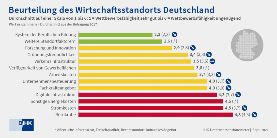 „Gerade nach den Erfahrungen der Corona-Krise fordern die Unternehmen immer nachdrücklicher, sich nicht mehr mit unklaren Regelungen und sich wiederholenden Datenangaben in Papierform befassen zu müssen", erläutert der DIHK-Präsident diesen Punkt. Auch den Ausbau der digitalen Infrastruktur etwa bei Glasfaserleitungen beurteilen die Betriebe als schlecht (Note 4,3 nach 3,7 vor vier Jahren). Adrian: „In der Praxis erleben viele Betriebe langwierige Planungs- und Genehmigungsverfahren, die immer noch nicht digitalisiert sind. Öffentliche Investitionen in eine schnelle digitale Verwaltung sind deshalb dringend nötig, damit Unternehmen zügiger investieren können."