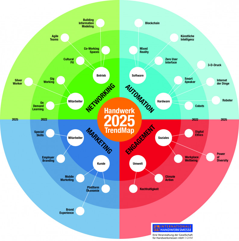 Gemeinsam mit Experten und anhand erfolgreicher Beispiele aus der Praxis wird an drei Terminen je ein richtungsweisendes Thema beleuchtet. Inspiriert sind die geplanten Schwerpunkte „New Work“ (18. September 2019), „Nachhaltigkeit“ (20. November 2019) und „Digitalisierung im Handwerk“ (29. Januar 2020) von der „Trendmap Handwerk“ (www.ihm.de/trendmap), die 25 zentrale Trends im Handwerk bis ins Jahr 2025 aufzeigt. Entwickelt von Trendforscher Prof. Peter Wippermann gemeinsam mit der GHM Gesellschaft für Handwerksmessen mbH wurde sie im Rahmen der Internationalen Handwerksmesse im März 2019 erstmals vorgestellt.