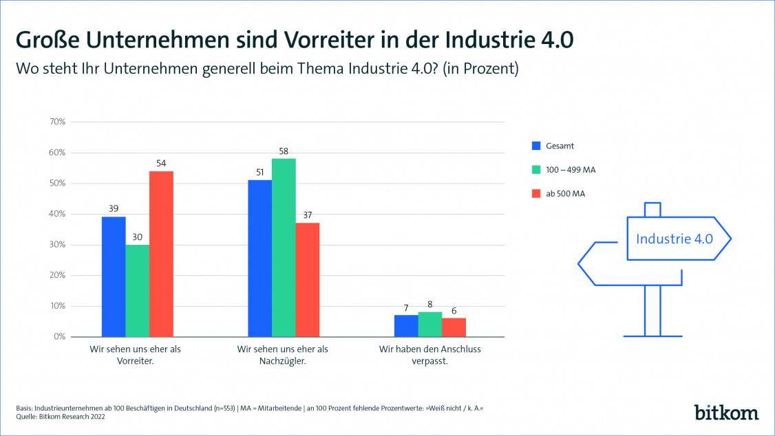 Immerhin 39 Prozent der deutschen Industrieunternehmen sehen sich als Vorreiter der Industrie 4.0. Andererseits gruppiert sich jedes Zweite (51 Prozent) als Nachzügler. 7 Prozent der Unternehmen fühlen sich abgehängt. Den größten Nachholbedarf hat der Mittelstand. So bezeichnen sich 58 Prozent der Unternehmen mit 100 bis 499 Beschäftigten als Nachzügler und nur 30 Prozent als Vorreiter. Unter den großen Unternehmen ab 500 Mitarbeitenden ist es umgekehrt: Lediglich 37 Prozent sehen sich als Nachzügler, mehr als die Hälfte (54 Prozent) als Vorreiter.