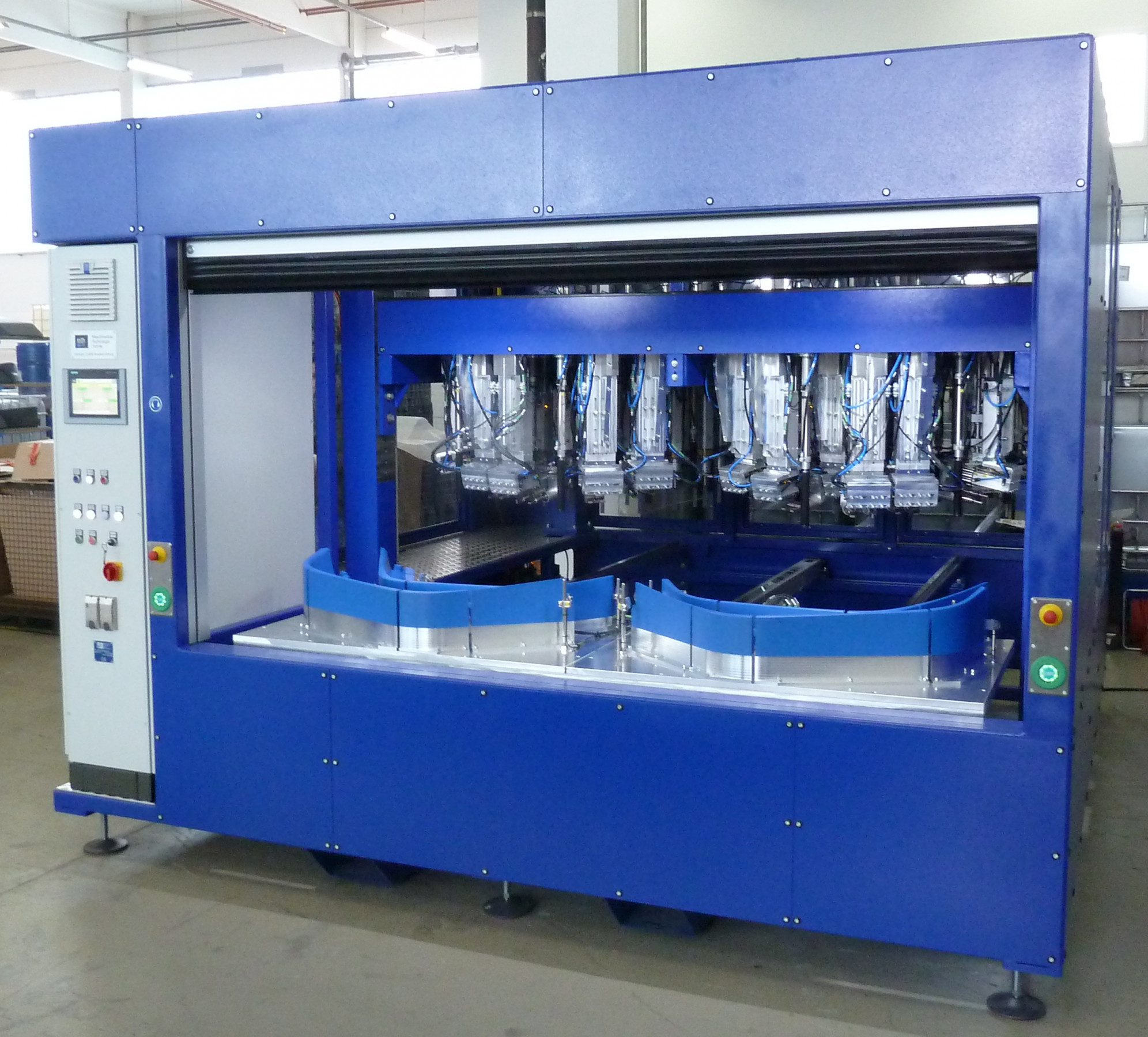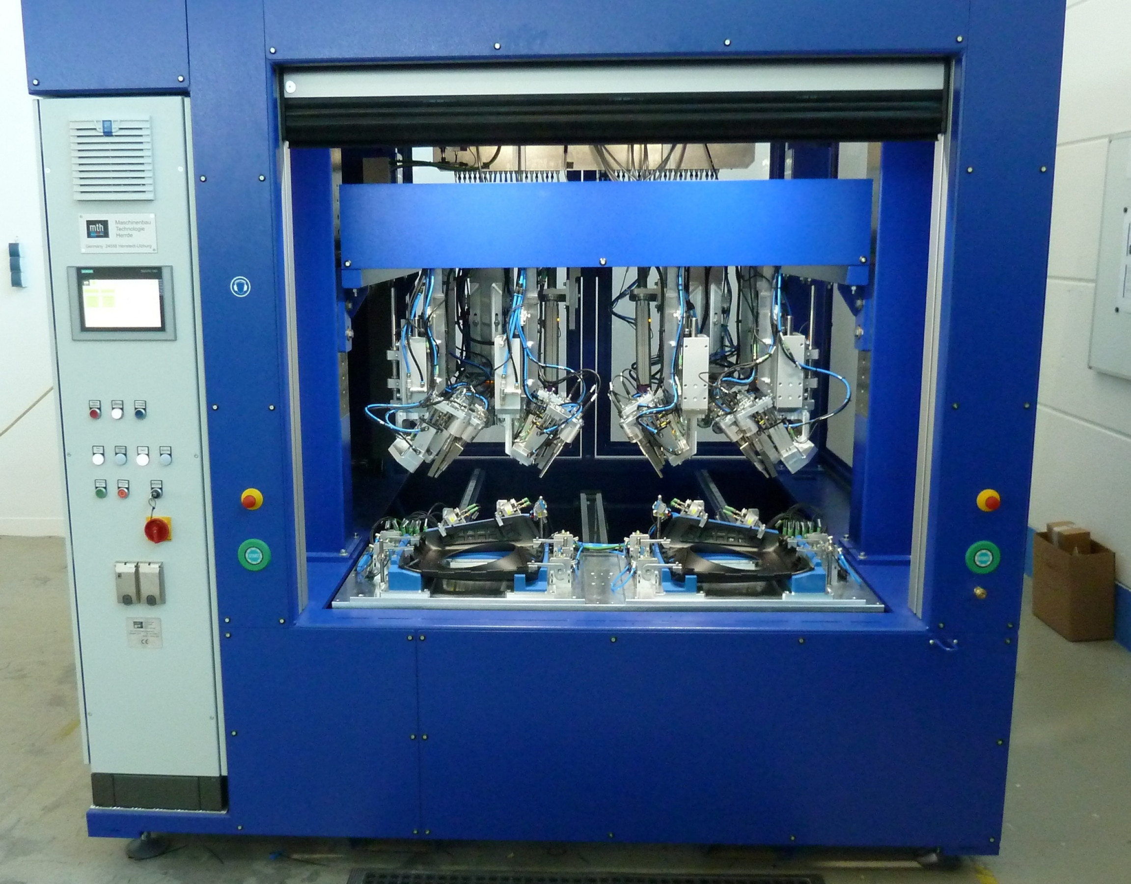 Bei Sondermaschinen von MTH ist das Arbeitsprinzip gleich, aber die Verbindung der Kunststoffteile erfolgt voll automatisiert nach vorgegebenen Parametern. Auf diese Weise kann in kurzer Zeit eine vordefinierte Anzahl von Schweißpunkten an den der Anlage zugeführten Bauteilen millimetergenau angebracht werden.