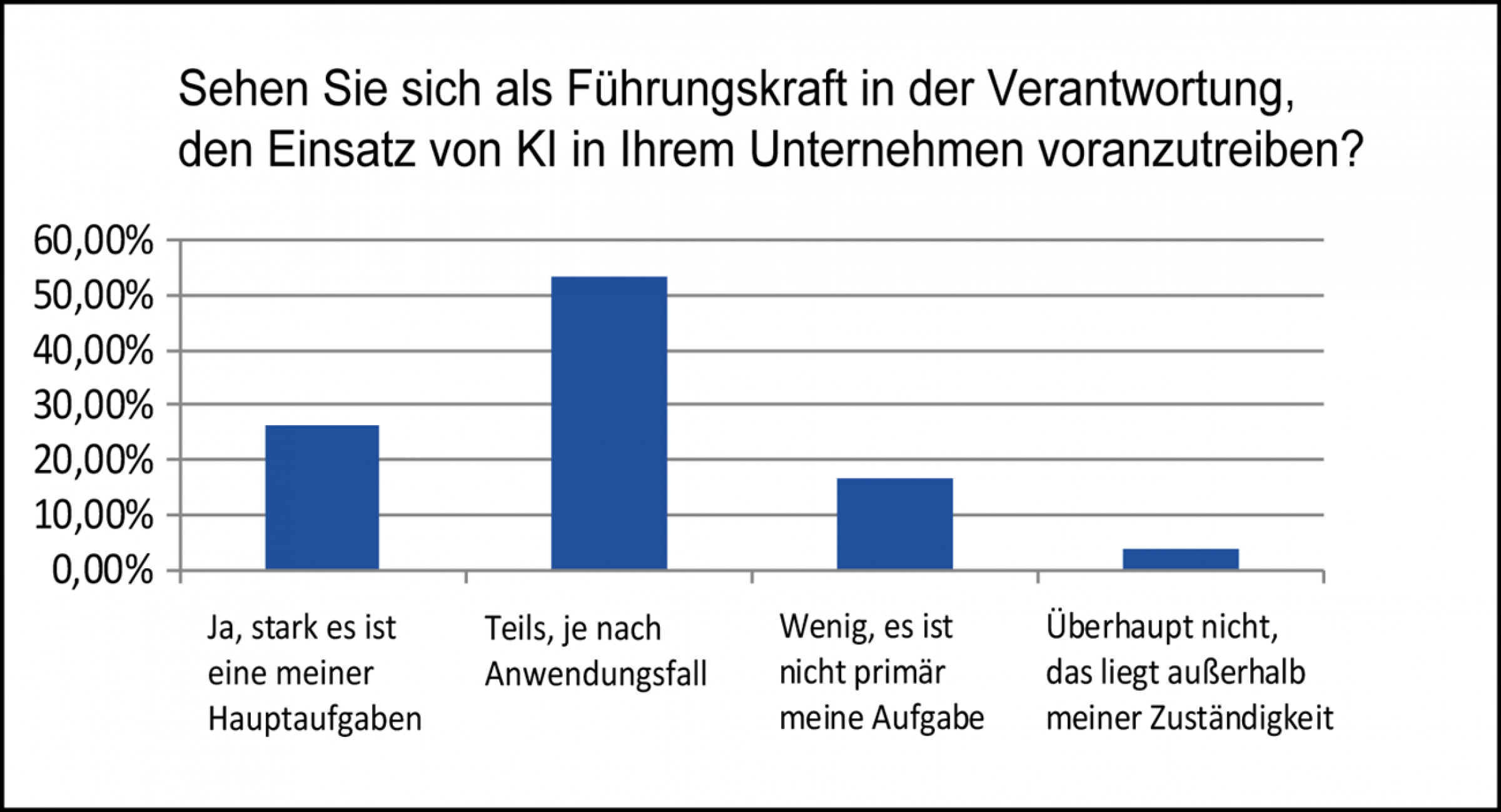 An der Online-Befragung nahmen 275 Führungskräfte teil (Deutschland: 173; Schweiz: 54; Österreich: 48). Ihr zentrales Ergebnis war: Die meisten Führungskräfte haben ein ambivalentes Verhältnis zur KI-Nutzung in ihrem Betrieb sowie in ihrem eigenen Arbeitsalltag.