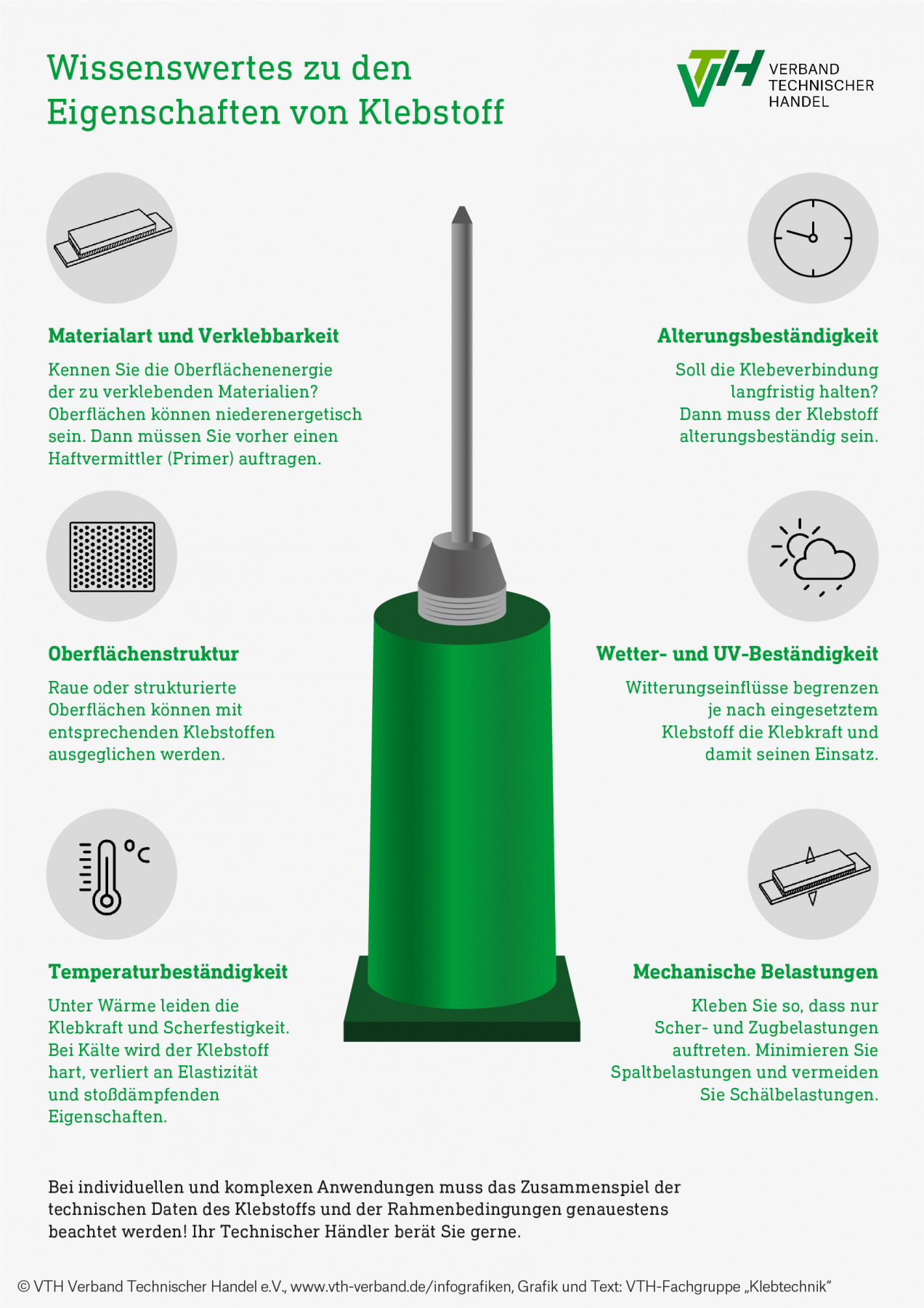 Die wichtigsten Aspekte zu Eigenschaften und Verarbeitung von Klebstoffen hat die VTH-Fachgruppe „Klebtechnik“ in neuen Infografiken aufbereitet: Eine führt die günstigen Eigenschaften von Klebstoffen für die Verbindungstechnik vor Augen. Die zweite Infografik verdeutlicht die komplexe Verarbeitung von Klebstoffen.