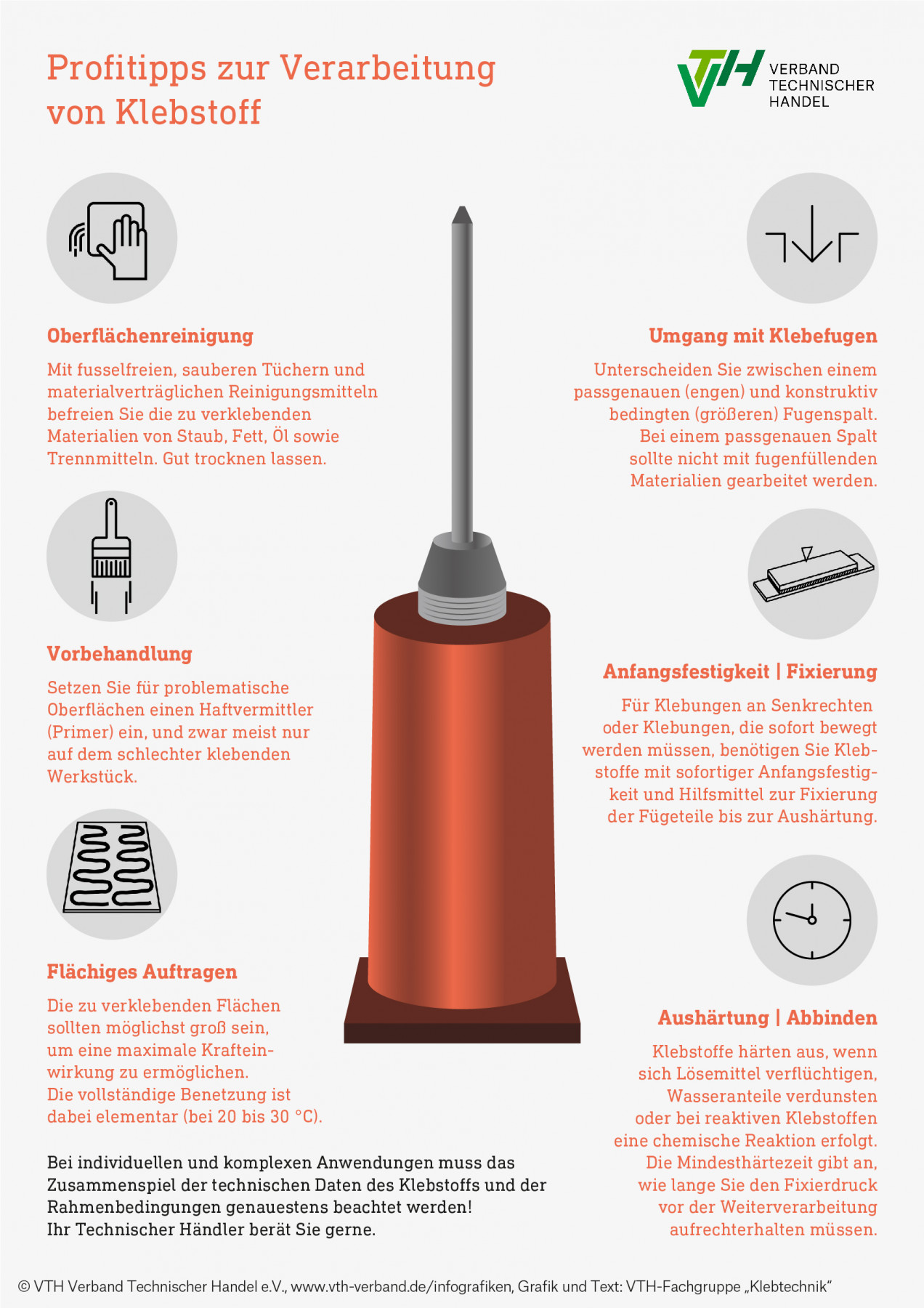 Mit Klebstoffen lassen sich sowohl „alte“ als auch innovative neue Werkstoffe perfekt verbinden. Für den jeweiligen Zweck bedarf es aber der Wahl des richtigen Klebstoffes. Der Technische Handel unestützt den Unternehmen dabei mit neuen Infografiken.