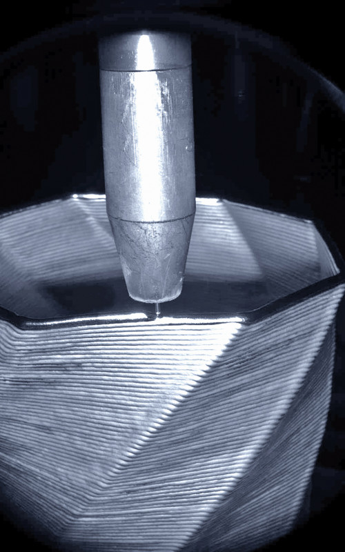 Für die Fertigung von Bauteilen mit WAAM sind die Stabilität des verwendeten Schweißprozesses und die Wärmeableitung entscheidend. Der Schweißprozess muss so energiearm, also so „kalt” wie möglich sein, damit untere Schichten nicht erneut aufschmelzen. Außerdem muss die geschweißte Lage durchgängig gleichmäßig und spritzerfrei sein. Fehler würden sich in den folgenden Lagen fortsetzen. Der MSG-Schweißprozess CMT von Fronius erfüllt diese Ansprüche. Er zeichnet sich durch einen stabilen Lichtbogen und einen kontrollierten Kurzschluss mit langen Kurzschlusszeiten aus. Der Wärmeeintrag ist geringer und der Werkstoffübergang annähernd spritzerfrei.