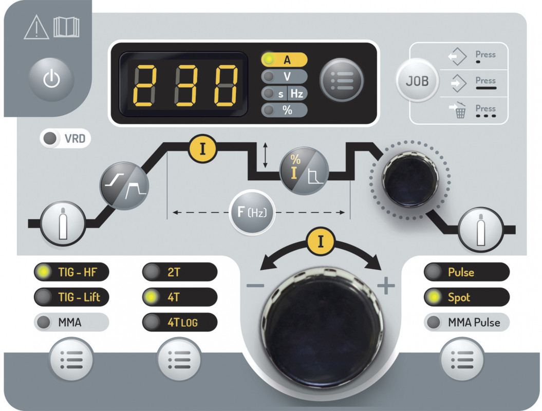Für die optimale Anpassung an verschiedene Anwendungen bietet das Gerät zwei spezialisierte Punktschweißarten: Im Spot-Modus lässt sich die Schweißdauer zwischen 0,1 und 60 Sekunden exakt einstellen, während der Puls-Modus mit einer Pulsdauer von 0,01 bis 60 Sekunden das Fixieren von Blechen vor dem eigentlichen Schweißen erleichtert. Zwei Zündarten stehen zur Verfügung – kontaktlos per Hochfrequenz (HF) sowie die LIFT-Zündung für empfindliche Umgebungen, in denen elektromagnetische Störungen vermieden werden sollen. Die Brennertastersteuerung kann flexibel zwischen 2T, 4T und 4T LOG gewählt werden.