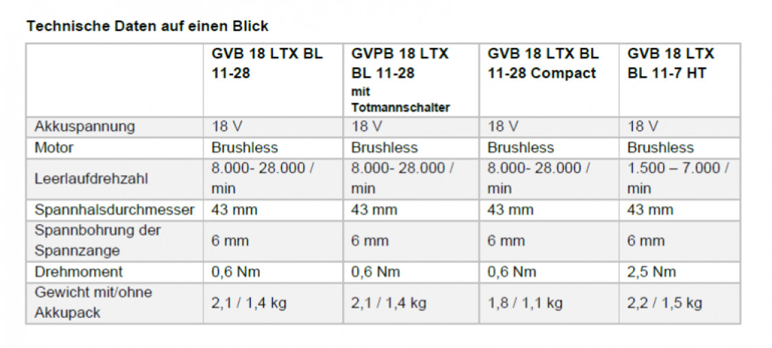 Die Drehzahlen von 8.000 bis 28.000 Umdrehungen pro Minute können in elf Geschwindigkeits-Stufen exakt an das Einsatzfeld und an das zu bearbeitende Material angepasst werden. Damit sind der GVB 18 LTX BL 11-28, der GVPB 18 LTX BL 11-28 und der GVB 18 LTX BL 11-28 Compact echte Allrounder bei der Verwendung von Fräsern, Schleifstiften und kleinen Lamellenschleifrädern. Durch seine reduzierte Drehzahl von 1.500 bis 7.000 Umdrehungen pro Minute eignet sich der GVB LTX BL 11-7 HT vor allem für Anwendungen mit großen Lamellenschleifrädern – so wird beispielsweise das Anlaufen des Edelstahls bei der Bearbeitung deutlich minimiert. Das Compact-Modell ist besonders leicht und mit seinem verkürzten Spannhals ideal für enge Bereiche oder Überkopfarbeiten.