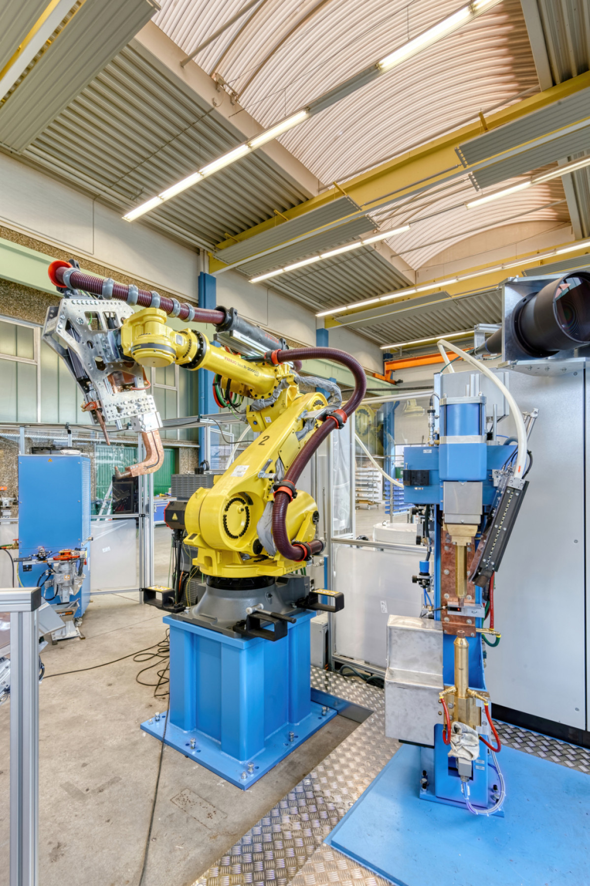 Die Einzelteile der jeweiligen Bauteile werden von einem Bediener in beide Seiten der Bauteilaufnahme der Anlage gelegt, wo sie pneumatische Kraftspanner und Magnetgreifer sicher spannen bzw. fixieren. Nach einer 90°-Drehung positioniert der Drehtisch die Bauteilaufnahmen mit den Bauteilen am ersten Schweißroboter. Bestückt ist der Roboter mit einer Punktschweißzange und der Dosiereinheit für den Kleber.