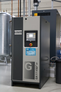 Davon war auch Alexander Merz überzeugt: „Die Energiekosten werden in Zukunft eher weiter steigen. Wir haben uns deshalb für einen teureren, aber effizienteren Kompressor entschieden.“ Denn der drehzahlgeregelte GA-VSD+-Kompressor erzeugt die Druckluft absolut bedarfsgerecht und mit weniger Energieeinsatz als andere Maschinen. Entsprechend niedrig sind die laufenden Kosten. In der „Full-Feature-Version“, auf die das Kürzel FF bei der Kendrion-Installation hinweist, ist zudem ein Kältetrockner schon ab Werk integriert. Ein Aktivkohlefilter des Typs QDT 45 scheidet effektiv das Restöl aus der Druckluft ab und stellt die für die N2-Erzeugung erforderliche Druckluftqualität sicher.